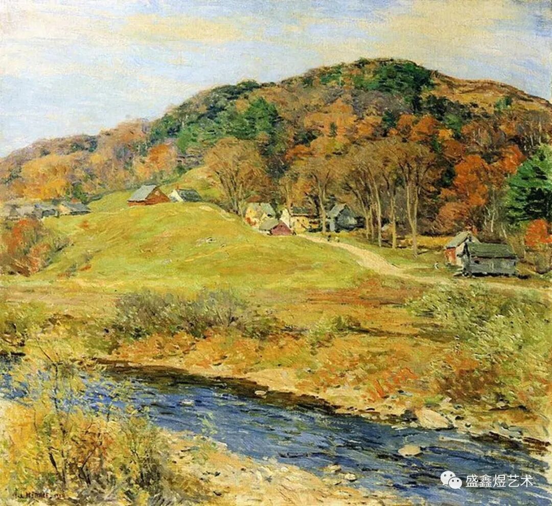 梅特卡夫专门在户外绘画,这种对自然的直接研究既是他绘画技巧的一部分,也是他收集自然标本的爱好的一部分。1906 年,一位评论家说,梅特卡夫“纵容将田野、花园和傍晚空气的清新和芬芳转化为绘画。他告诉我们的是大自然,而不是工作室。” 正是在他对新英格兰风景的绘画中,梅特卡夫真正出类拔萃,捕捉了秋日清爽的色彩和氛围,并促使他被指定为新英格兰山区的桂冠诗人。他擅长描绘树木变色或冬冰融化进入春天的季节。