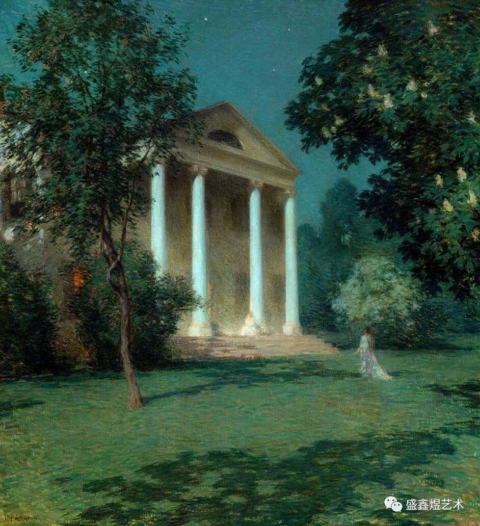 威拉德·勒罗伊·梅特卡夫(Willard Leroy Metcalf)在吉维尼画了莫奈的花园,将法国印象派的经验应用到新英格兰风景中。今天,他不像玛丽·卡萨特、莫里斯·普伦德加斯特和其他美国印象派画家那样出名,但事实证实了他在许多方面与他们不相上下。他独特的印象派技法,加上他自己强硬的现实主义风格无法立即归类。他方法的直接性、他的乐观和缺乏自我意识并没有使他受到现代主义品味的喜爱。但他最好的作品令人叹为观止。在旅行中,他捕捉到了突尼斯街道、哈瓦那港口和祖尼村的诗意,