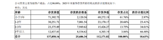 不做自己的工厂意味着失去了一定程度上的主动权,加上门店的高速叠加,大量存货开始出现,美邦加盟渠道应收账款坏账金额逐年增加。2021年年报显示,存货占比98.89%,跌价损失以亿计,并且迎来了更大程度上的反噬。截止2021年12月31日,美邦计提坏账准备为4.9亿元。