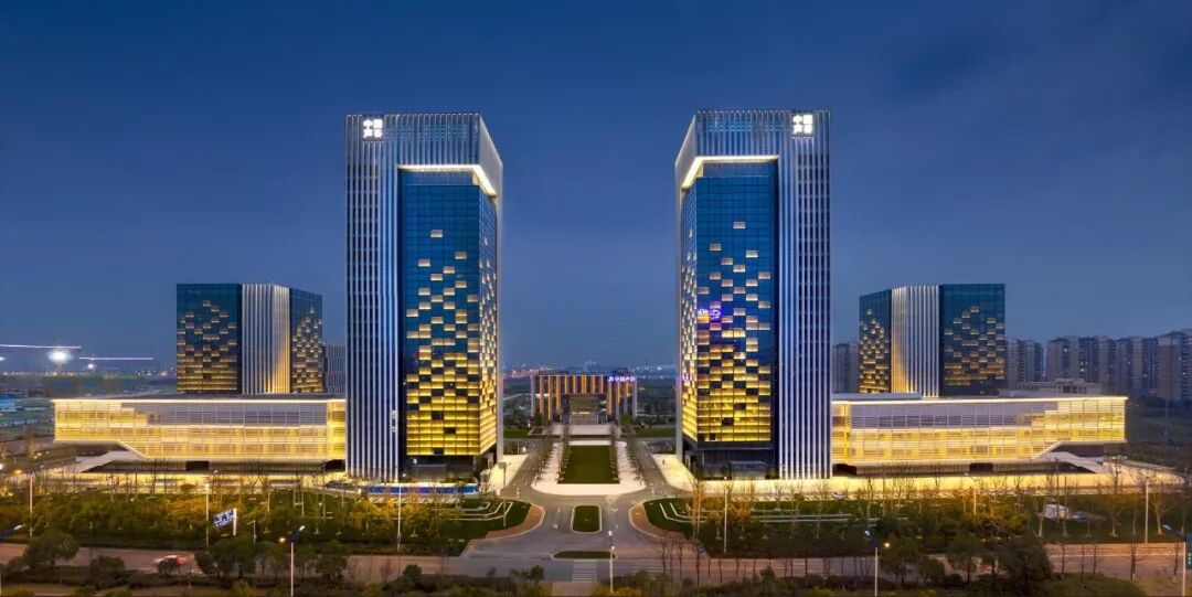 四栋高低错落的塔楼沿主干道依次展开,形成了极具标识性的城市天际线,建筑形象通过开窗形式及夜景亮化呈现出抽象化的语音波谱形态,与中国声谷的产业主题相呼应。平行铰链窗的应用,使光线不再受窗户开启角度不同产生不同的变化,体现纯净且富有韵律感的研发企业形象。