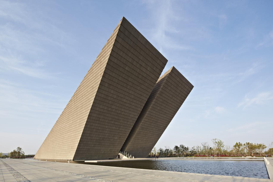 从正面看纪念馆,它就像两个庄严肃穆的纪念碑伫立在湖畔。为了增加建筑的分量感,建筑师用了一种名为GRC的复合材料,一层一层的叠色上去,通过特殊的纹理和触感传递给了人们一种历史的厚重感。