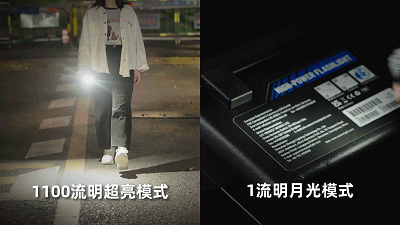 极亮档(300-1100流明)、高亮档(250流明)、中亮档(150流明)、低亮档(50流明)、月光档(1流明)...只需一键即可轻松任意切换。