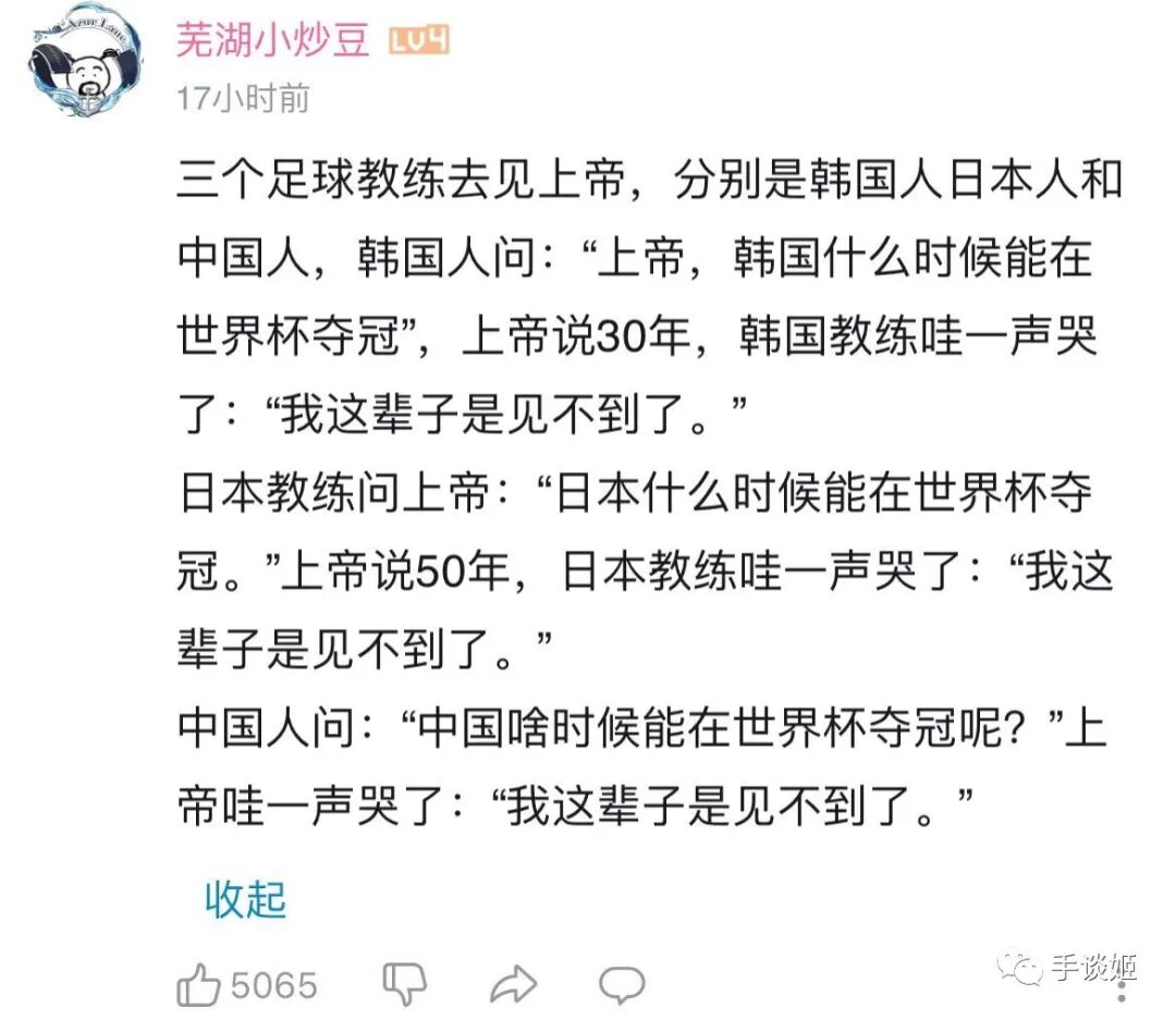 手谈姬平日不怎看球,看到微博里刷屏的“国足输球”词条刷屏,刚开始有些错愕,心想:国足输球,这事也没少见啊?