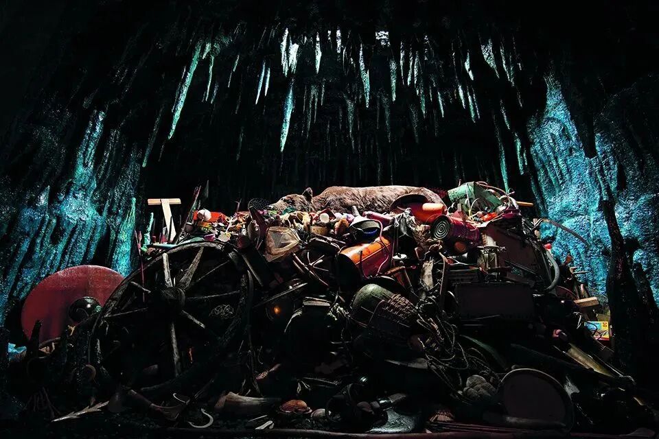 艺术家们有时会主动选择回到洞穴:来自美国艺术家Mark Dion的艺术装置:一只巨大的棕熊匍匐在由来自世界各地物品所堆积的小山上。