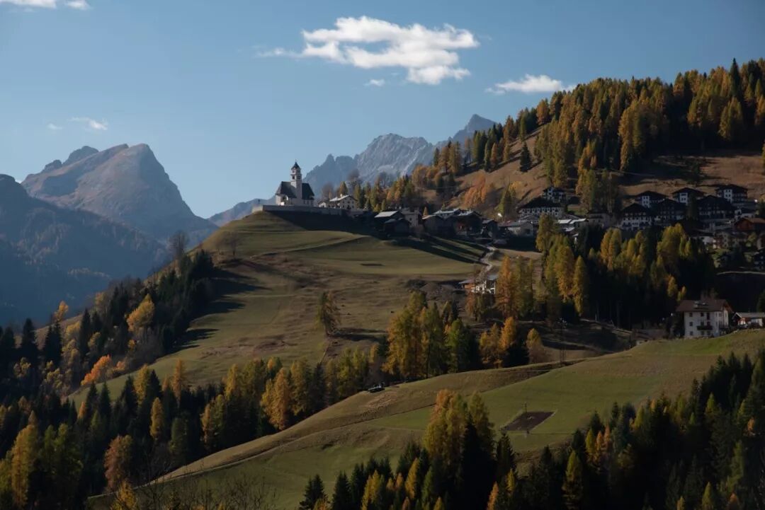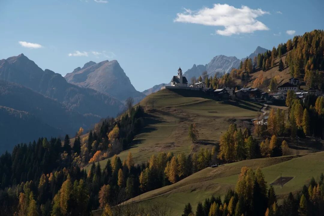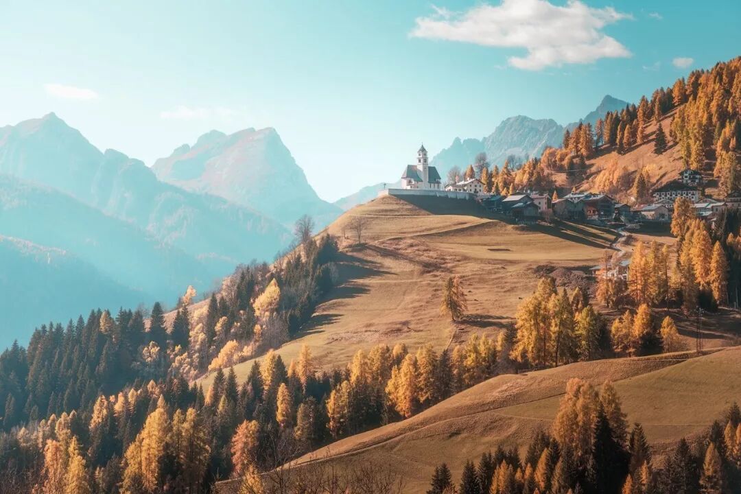 后面我们开车到一处并不知名的小镇上时,我突然发现了远处小山坡上的教堂,教堂周围是秋天金色的树林,远方是巍峨的雪山剪影,建筑与周围的自然环境很好的融合在了一起。