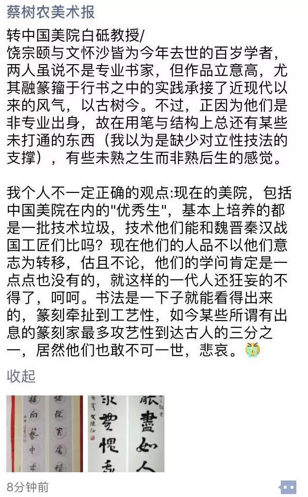 蔡树农:以下纯粹是我个人观点,不一定正确,欢迎批评:现在的美院,包括中国美院在内的"优秀生",基本上培养的都是一批技术垃圾,技术他们能和魏晋秦汉战国工匠们比吗?现在他们的人品不以他们意志为转移,估且不论,他们的学问肯定是一点点也没有的,就这样的一代人还狂妄的不得了,呵呵。书法是一下子就能看得出来的,篆刻牵扯到工艺性,如今某些所谓有出息的篆刻家最多攻艺性到达古人的三分之一,居然他们也敢不可一世,悲哀。