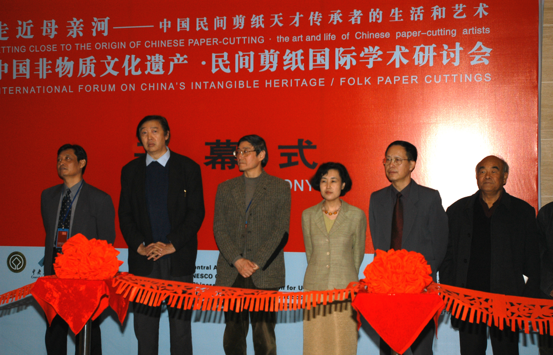 2004年,“中国非物质文化遗产·民间剪纸国际学术研讨会”开幕式,从左至右分别为:杨力、冯骥才、潘公凯、高晓桥、刘疆、靳之林。