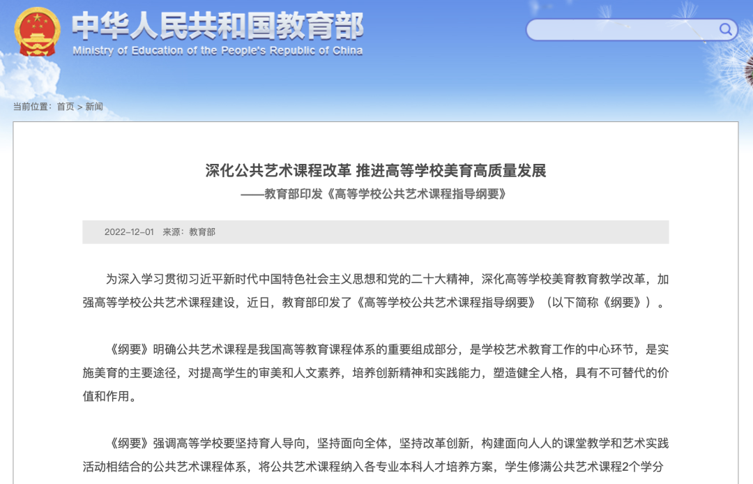 ——坚持面向全体。高等学校应面向全体学生开设公共艺术课程,搭建丰富多彩的艺术实践活动平台,完善面向人人的高等学校美育育人机制,让所有在校大学生都享有接受美育的机会。