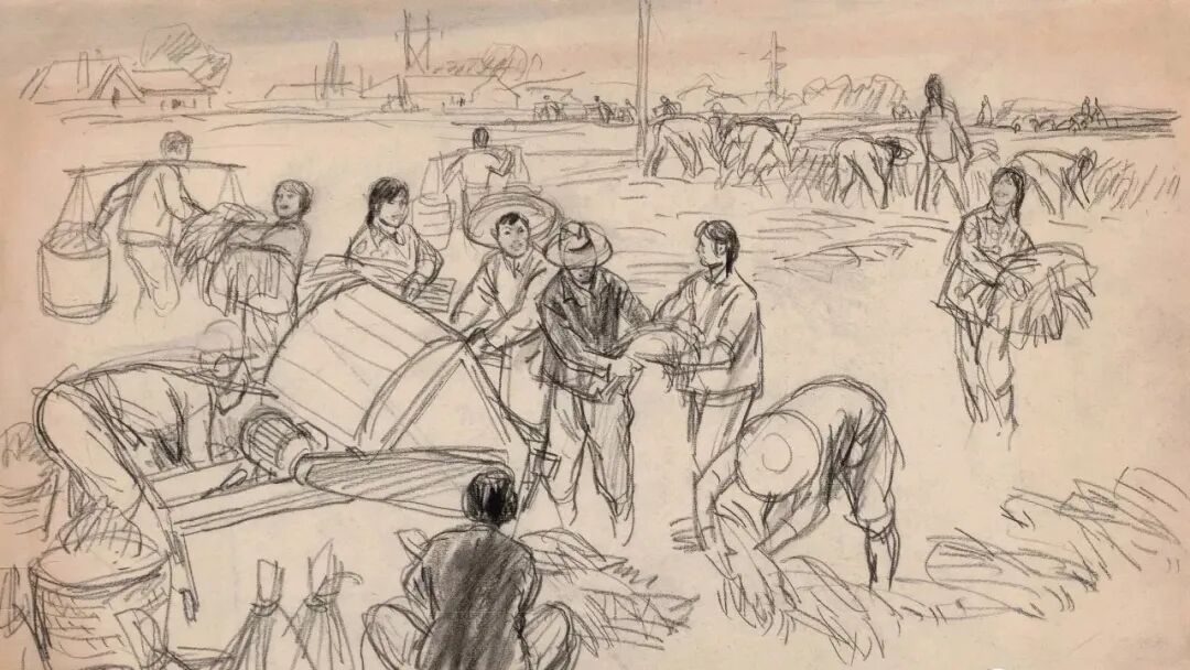 ▲秋收时节/生产队社员收割晚稻的场面(1974 年)