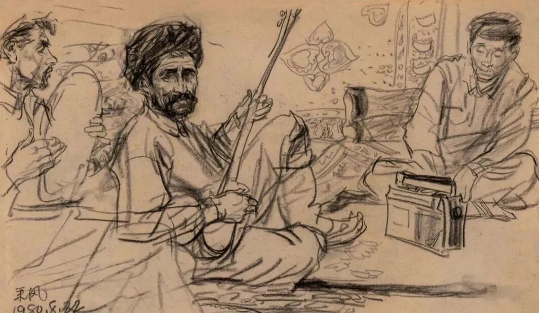 ▲为塔吉克族老艺人录制弹唱曲目(1980 年)