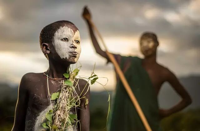 一个埃塞俄比亚游牧民族男孩的面部彩妆和服饰