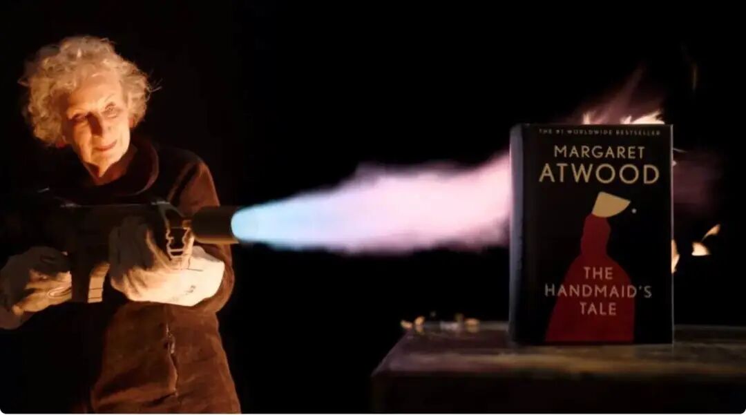 为了证明它的防火性能,作者玛格丽特·阿特伍德手持火焰喷射器亲自试验。