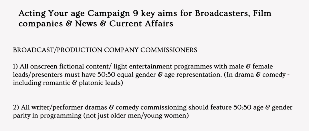 在Juliet Stevenson、Meera Syal等英国100多名演员和公众人物共同签署的一封公开信中,Acting Your Age Campaign(演出你的年龄)呼吁英国45岁以上的男性和女性演员享有平等的表演机会,并呼吁立即就“平等承诺”采取行动。