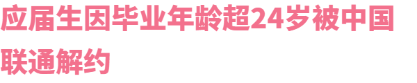 5月26日,广东河源应届生何同学反映,通过去年秋招与中国联通河源分公司签订“三方协议”,近日被告知因年龄超24岁需要解约。何同学称,她是1998年2月出生,今年刚满24岁,签三方之前都经过背调审核,现在突然说本科应届生不能超24岁,非常不能理解。目前分公司有6人都因年龄被解约,应届生身份没了,工作也找不到了。