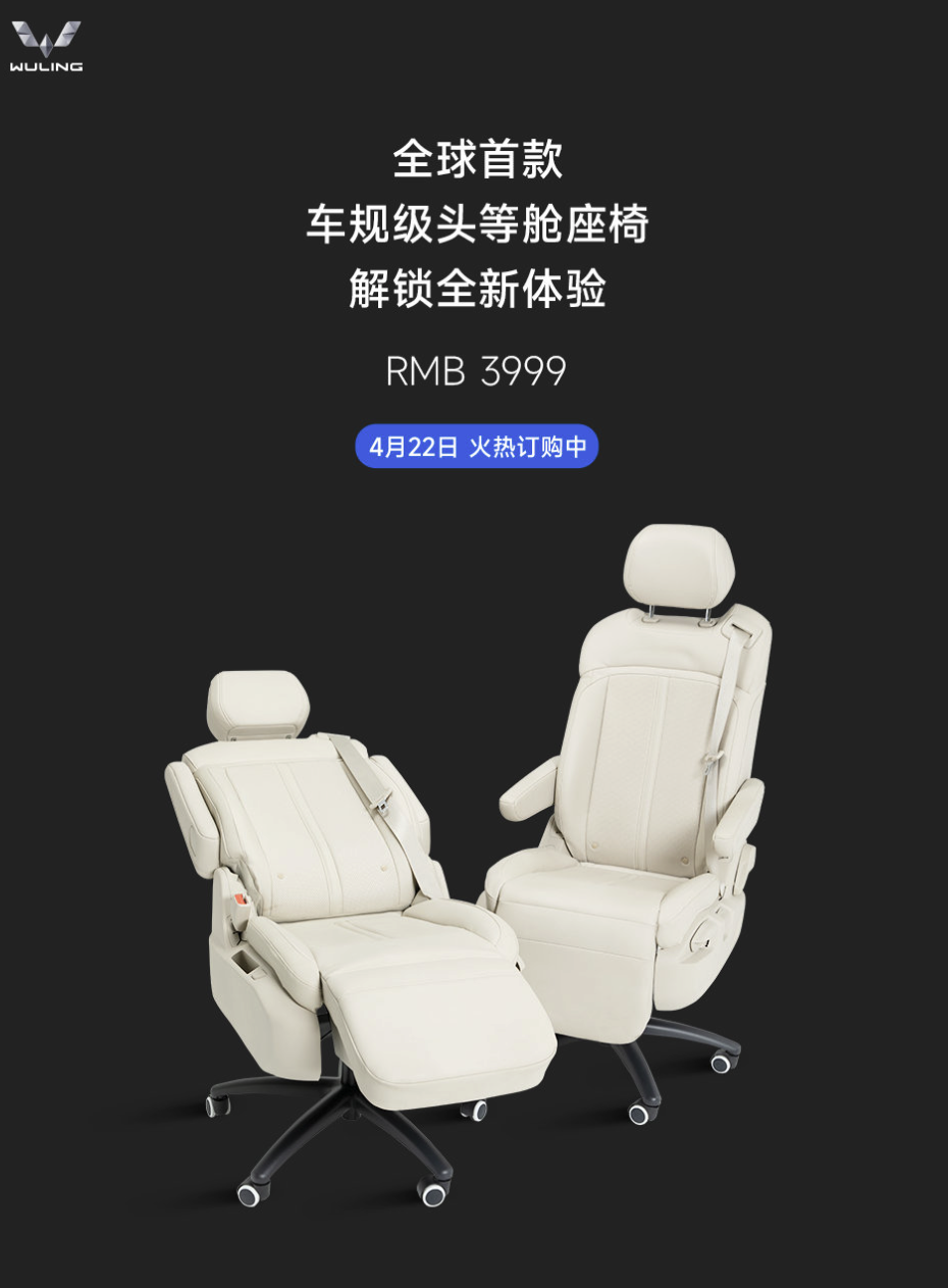 五菱把凯捷汽车的座椅改成了工学椅,于4月22日发布,单价3999元,还保留了安全带。目前尚未正式开始售卖。