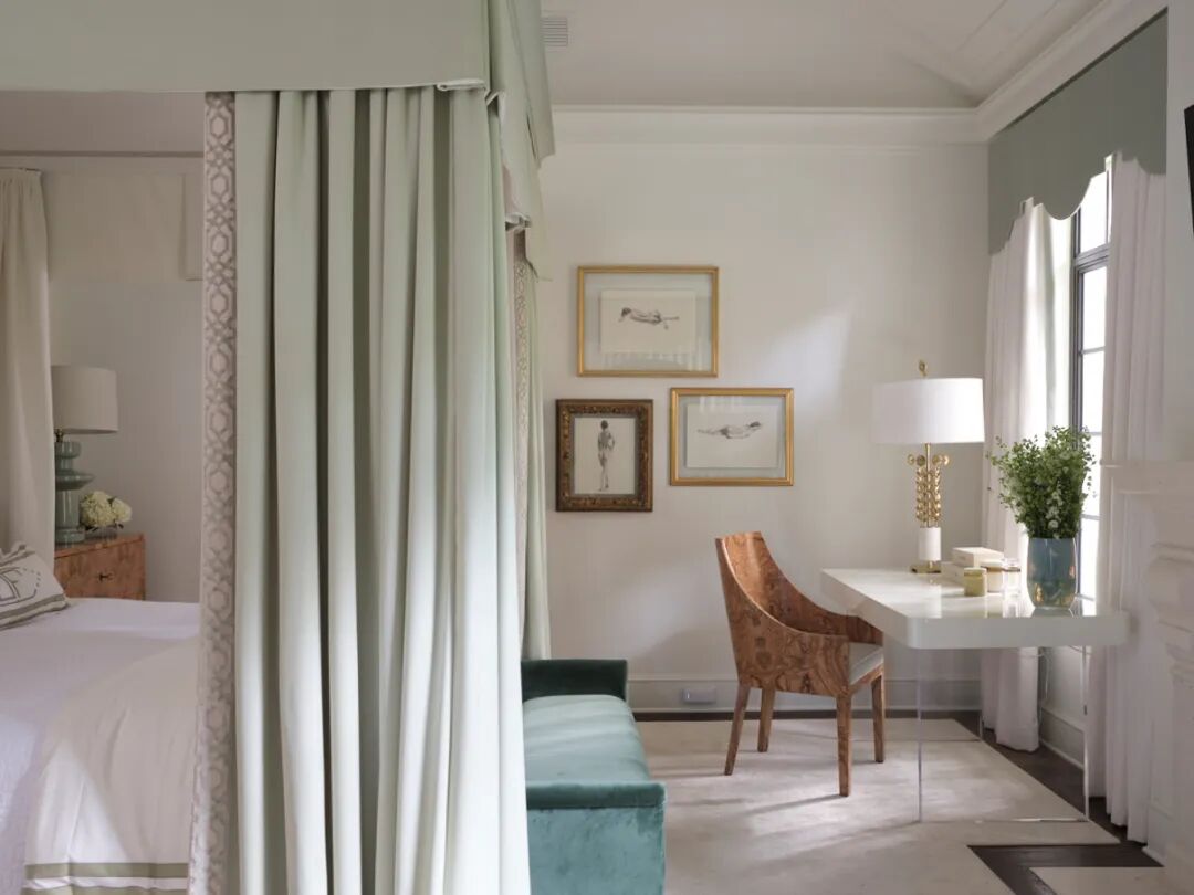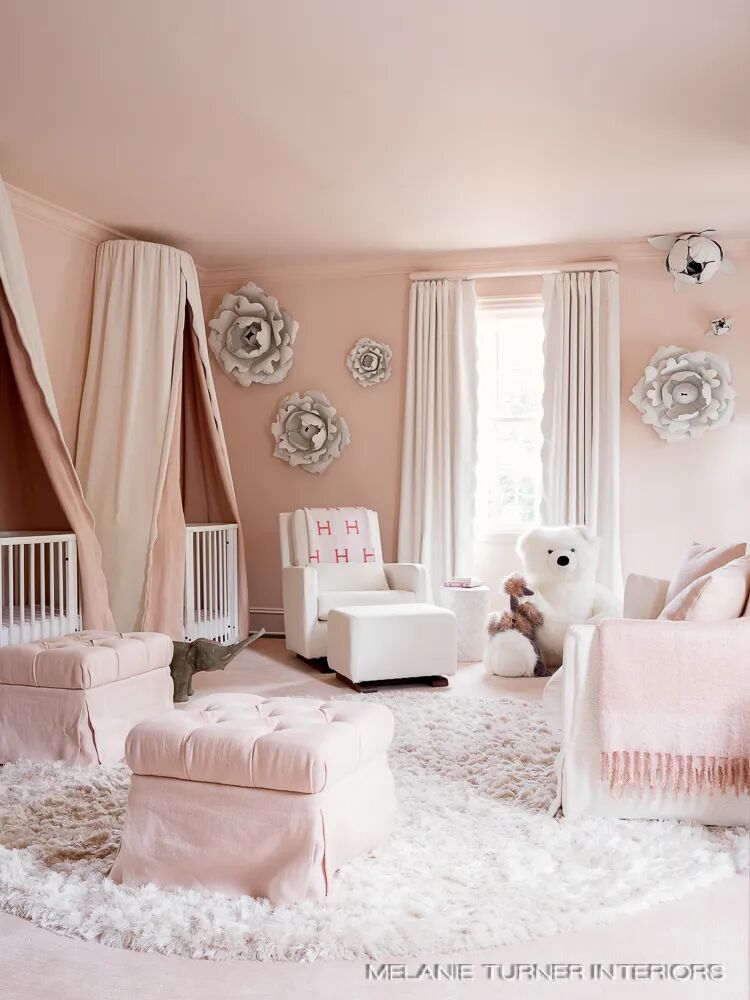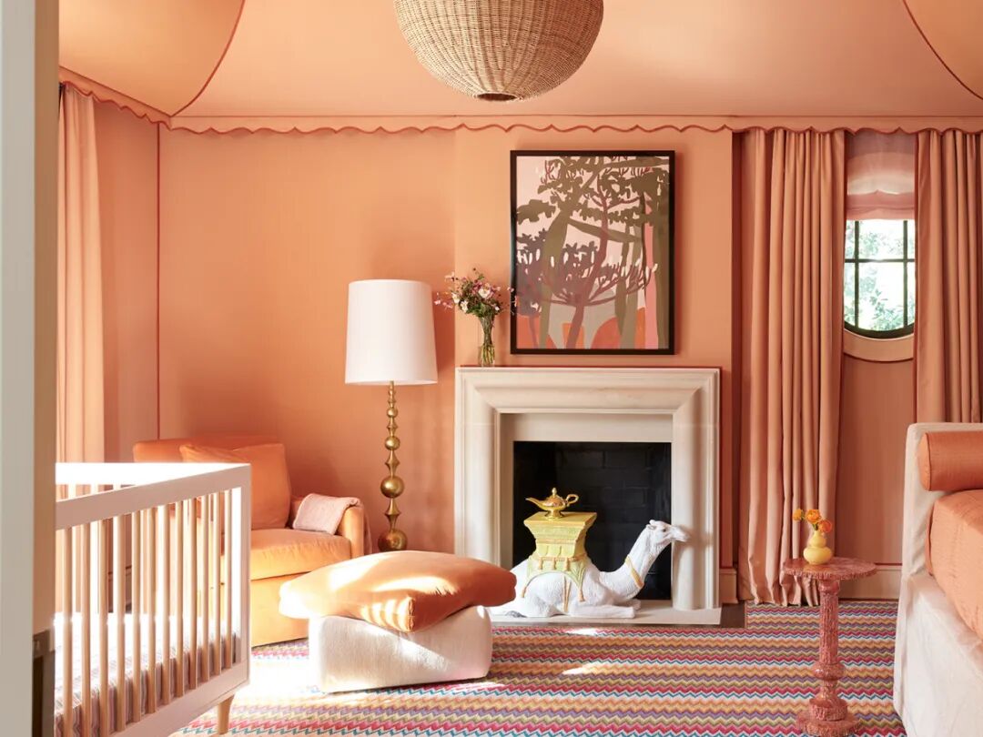 Melanie Turner在这间1934年摄政风格的房子中创建了一个梦幻般的婴儿室,房间内被柔和的淡粉色调包围。窗帘、床罩、椅子和脚凳以及扶手椅都来自C.&C. Milano品牌的面料。