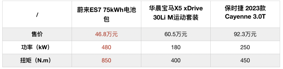 蔚来ES7的对标产品是保时捷卡宴和宝马X5,但仅从动力性能上对比的话,售价50万级别的蔚来ES7可以直接叫板价格接近两百万的保时捷卡宴turbo 4.0T 版本和售价超百万的宝马X5 M。