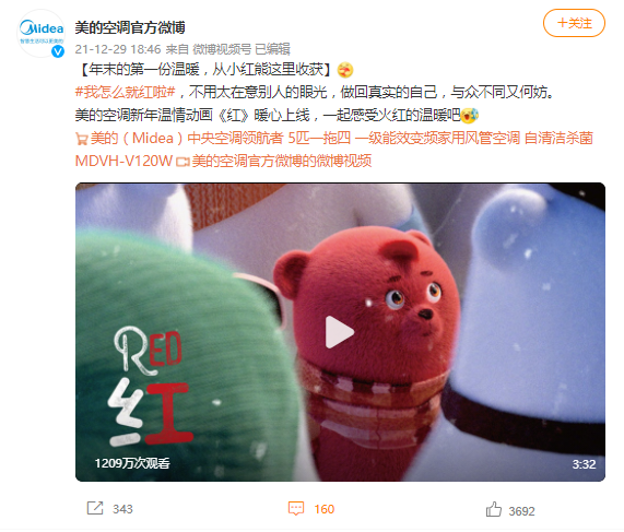 最新文章2023-03-23 萌化了!美的空调新年动画广告,治愈感爆表! 作者 | 林羽 来源 | 品牌传播案例(ID:Brand1916) 2022年春节即将到来,春节是中国人最期待最重要的节日,象征着平安、团圆,同时也是各大品牌争相借势的重要节点,摩拳擦掌使出浑身解数放出自己的吸睛营销大招,以获得消费者的青睐。 新奇的是,美的在近日就延续「爱不冬眠」IP,带来第五季新年温情动画《红》,借“讲故事”的方式,恰到好处地激发了一波用户底层心智共鸣,具象化塑造起品牌暖心形象。 借势感性节日氛围 美的空调新年动画《红》暖心献映 产品是死的,而故事是有生命的。广告的本质即是沟通,而讲故事就是一种高明的沟通策略,在一定程度上赋予产品以特定价值与生命力,从而为品牌形象带去增幅效果。 随着新年的到来,美的空调上线新年温情动画《红》,讲述一只红色小熊借白雪掩盖自己的不同,最后在家人朋友的爱与陪伴里接纳自我的故事。 主人公小熊常常因为自己与众不同的红色外貌而自卑,看到一众白熊骤然感觉自己成了“怪异”的一个,甚至在上学的时候也不敢进入教室,他试图用白雪来做自己的「保护色」,在受邀去熊小美家过新年时也用白雪装扮自己。 但空调的暖流让「保护色」逐渐融化,正在他自卑的时候,戴着红帽子、围着红围巾红手套的熊小美一家将他团团抱住,用爱融化白雪保护色,自然引出结尾文案——「本色出演」,勇敢做自己。 短片展现出美的全季候中央空调无风迅速温暖全屋的产品特点,也借此传递出人们都能够勇敢做自己、对新的一年的美好祝福。 自2018年起美的在每年的新年时分都会带来「爱不冬眠」的暖心动画短片,此次以《红》为主题的第五季,在寒冷的冬天无形中向用户传递着温情力量。 从营销层面上说,没有一句旁白的温情动画,用一场简单但又耐人寻味的故事,达成与消费者新年的沟通,在激发大众共鸣情绪的同时,也潜移默化地传达出产品功能卖点。 产品功能卖点软性植入 借情感化语言激发底层心智共鸣 知名畅销书《故事》的作者罗伯特·麦基曾提笔到:故事天然受到人类心智的关注,它们能把信息包裹在故事中,一旦观众在那一瞬间将自己的感觉与主角联系起来,怀疑就会消失不见。 消费者喜欢听故事,是因为故事开辟了品牌与消费者新的沟通方式,双方不再是买卖关系,而更像一个陪伴者,由走心情节自然为品牌形象带去附加价值。美的的高明之处就在于对情感层面上的拿捏。 可以注意到,短片全程没有任何旁白,仅用镜头和文案呈现,却能由内而外给人以回味无穷之感,犹如大白一样的人物形象让人一举感受到切实的年末氛围 尤其是结尾文案上的一语双关:感受不一样的温暖,既表露出全季候中央空调美的领航者无风迅速温暖全屋的产品特点,同时也传达出蕴含在情节之中的人性温暖。 这种将产品软性植入与暖心故事之中,在情节的熏陶下,大大降低了消费者对广告的抵触心理;除此之外,品牌并没有放弃在社交平台上的营销造势。 年末的第一份温暖,从小红熊这里收获。12月29日,美的空调官微上线新年温情动画《红》,萌趣的外表、极具温度的文案,瞬间呈现出了极大的治愈感,充分制造出沉浸式的观感体验。 依托TVC本身所具有的暖心氛围,在评论区内,就引发了不少网友的共鸣热潮,表示“过好自己的生活 比什么都重要”、“很温暖的广告,后面还有热气球”,进一步促成话题涟漪式扩散传播效果。 某种程度上,美的空调新年温情动画《红》,更多是一种对暖心氛围的呈现,用一支从自卑到最终自我接纳循序渐进,巧妙地借势当下年末的感性氛围,实现与用户情感上的“同频共振”。 赋予「爱不冬眠」IP流量价值 具象化塑造品牌暖心底色 从营销层面上说,故事前半部分的红色小熊自卑心理,到后续的用爱融化白雪“保护色”,这种生活中常见的交际痛点,无疑牵动着大众情绪心弦。 然而,与其说此次美的年末营销只是单纯的激发用户共鸣,不如说是品牌“讲故事”的底层逻辑,在赋予「爱不冬眠」IP以流量价值的同时,塑造暖心形象。 随着Z世代逐渐成为社会消费主力军,“个性”、“独立”成为这一群体的主要标签,相较于早期“脑白金式”的洗脑广告,与消费者建立稳固的情感链接才是营销的关键之处。 可以注意到,美的空调新年温情动画《红》,将重心放在了故事情节搭建之上,产品更像是贯穿其中的“陪伴者”一般,最大程度上以情感力量击穿用户广告防火墙;这一方式对于营销人来说一定不会陌生。 早在去年母亲节之际,品牌就曾推出温情短片《马小冬的冰雪夏天》,讲述南方小城里马小冬和妈妈的故事。因为家中贫困马小冬家里买不起风扇和冰箱,妈妈为了儿子的幻想承诺自己会魔法,不辞辛苦为他运冰制作冰饮。 影片在最后还提出了对生活的洞察,妈妈在厨房做饭的热气往往超乎想象,总是弄得满头大汗,于是美的空调顺势在母亲节推出了小凉块便携空调,希望厨房的温度不要超过26°C,送上清凉,也送上爱意。 二者的共同点就在于“去广告化”的沟通方式,不再是一味的对平台自身进行广宣,而是着重态度和主张的传达,正如新年温情动画《红》中所传达的「本色出演」,充分表达了“勇敢做自己”的核心诉求。 其讨巧之处就在于将内容情节与产品卖点的有机融合,由一段暖心故事引导至美的领航者无风迅速温暖全
