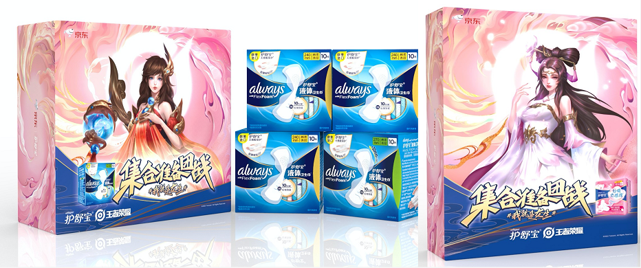 基于此,护舒宝精准把握年轻女性对王者荣耀的追捧心理,根据产品特性,选择了游戏中深受女性玩家欢迎的大乔和貂蝉这两位英雄,将人物形象叠加到产品上,推出破次元壁礼盒。
