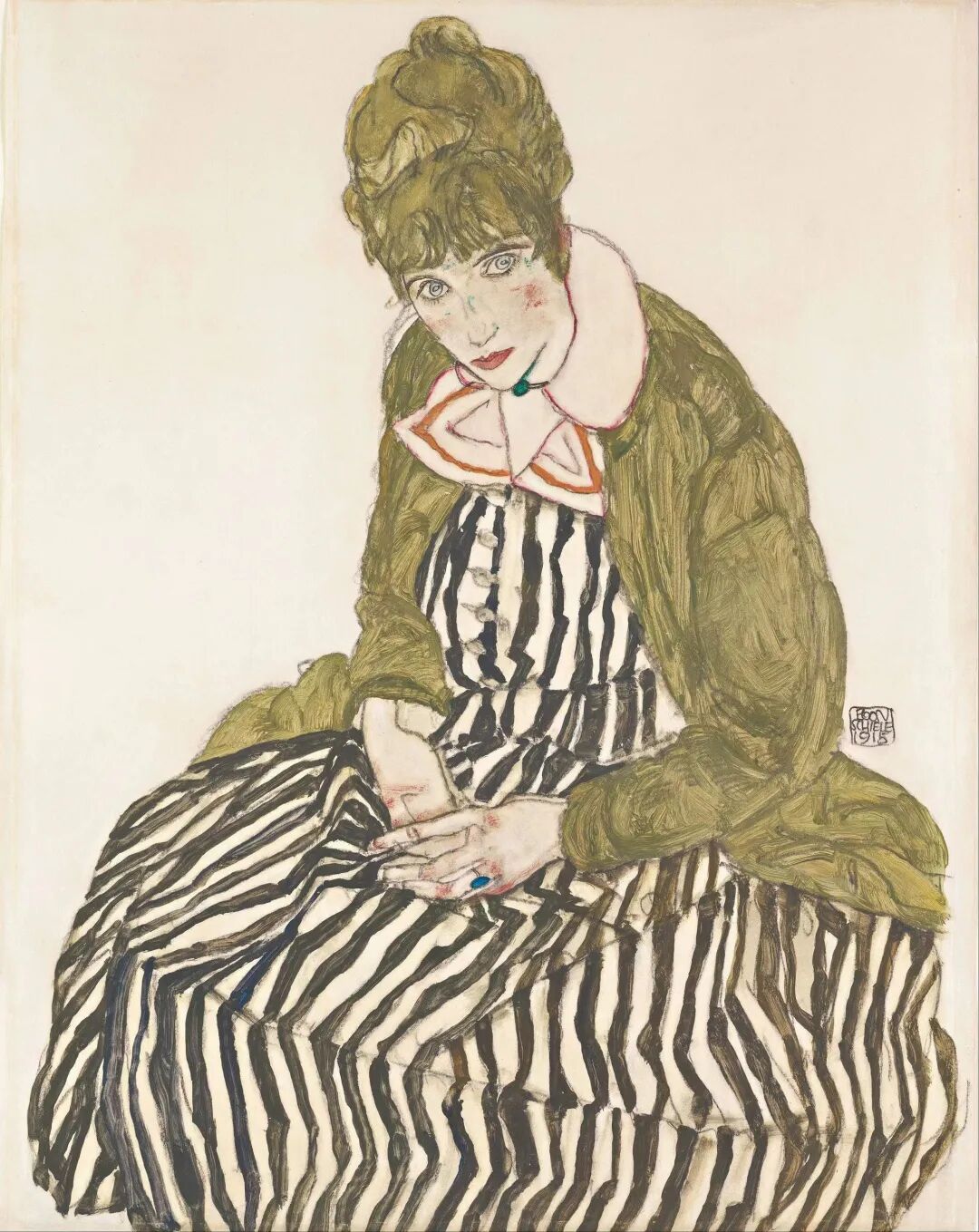Edith with Striped Dress, Sitting, by Egon Schiele, 1915.