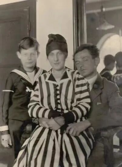 ▲穿黑白条纹连衣裙的伊迪丝,席勒,与他们的侄子,1915