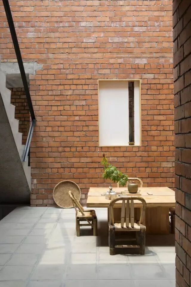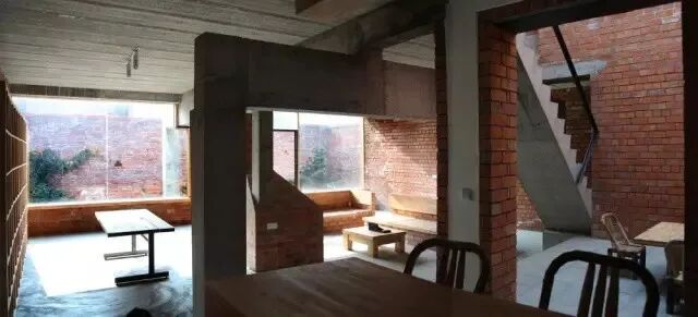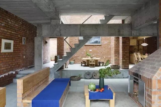 这个不只是单纯的室内改造,建筑整体的重建花费是不菲的,在造价有限的前提下,设计会受到限制,建筑师本来是没有考虑红砖的,是因为今年建材涨价太多,尤其是钢筋,地基打下去就花费了16w,所以后来出于造价的考虑才放弃了原方案改用便宜又符合当地乡村气质的红砖(并且也是设计师熟悉的处理方式)。