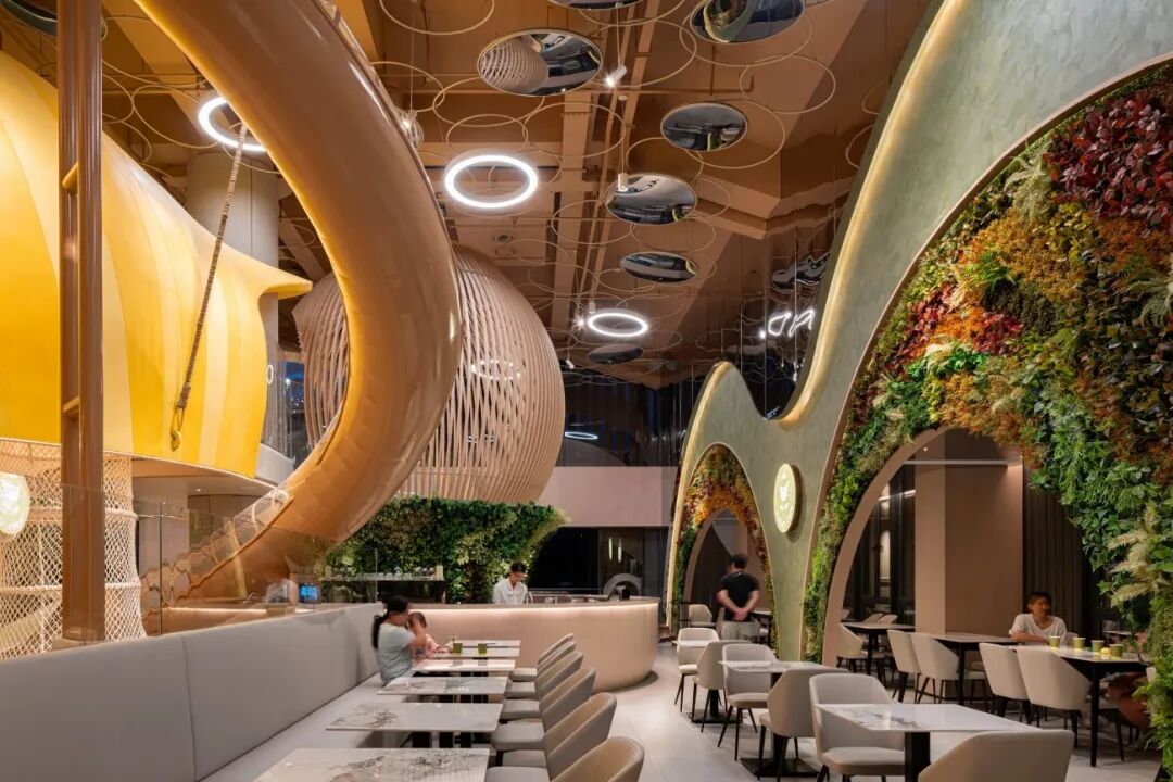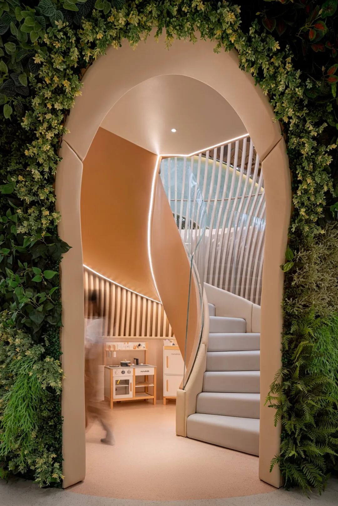 他们在视觉上与坐在家庭咖啡馆里的父母有联系,那里提供食物和点心。可以举办不同的活动包括儿童生日派对和社交活动。通高的绿化墙完善了这个双层空间的休闲体验。