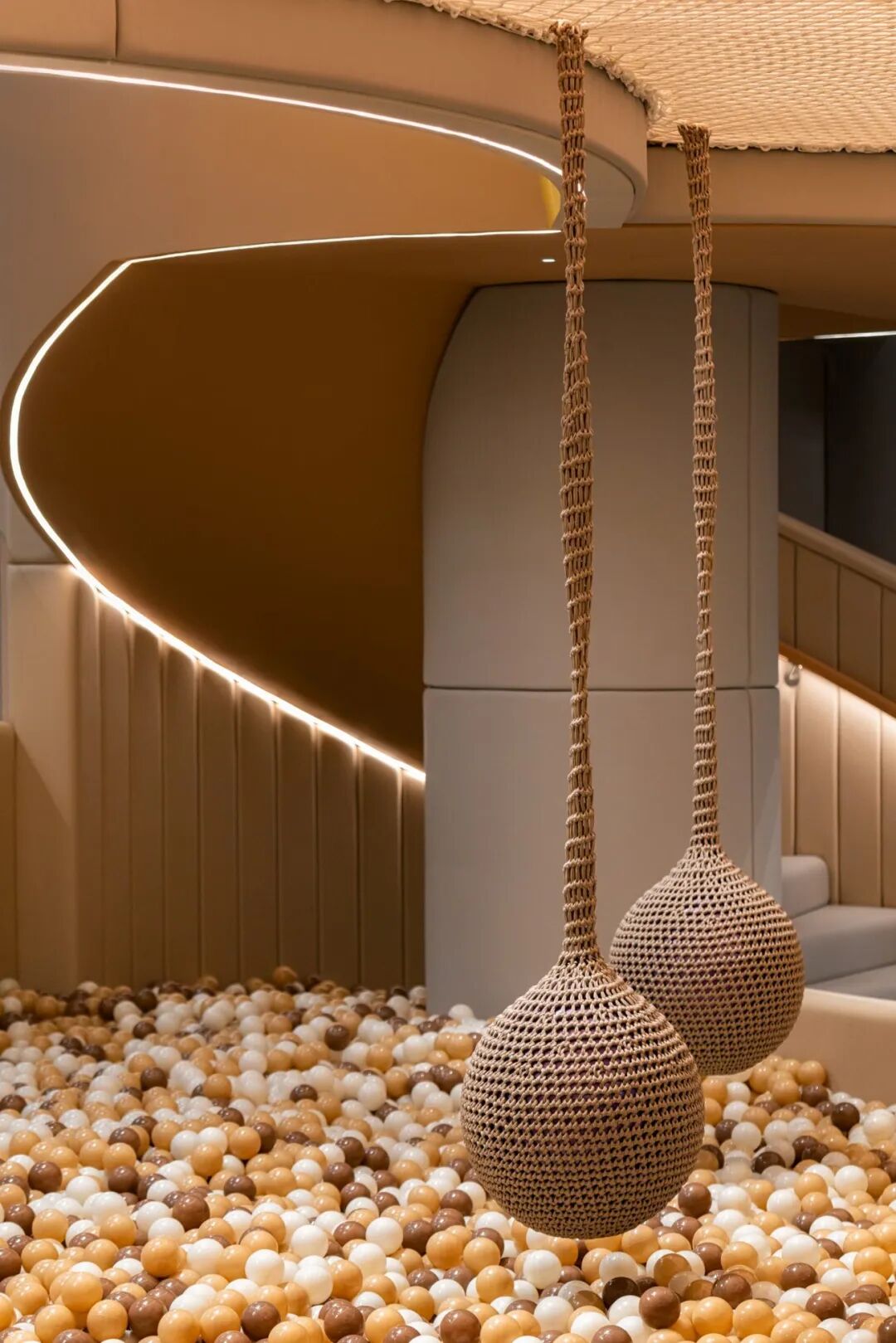 黄色调的第二个区域是沙滩式的开阔区域,球池、跳跃和攀岩绳索排列,夹层与茧桥相连。这是一个由橡胶、塑料和绳索组成的游乐空间,可为孩子们提供多种触觉体验。