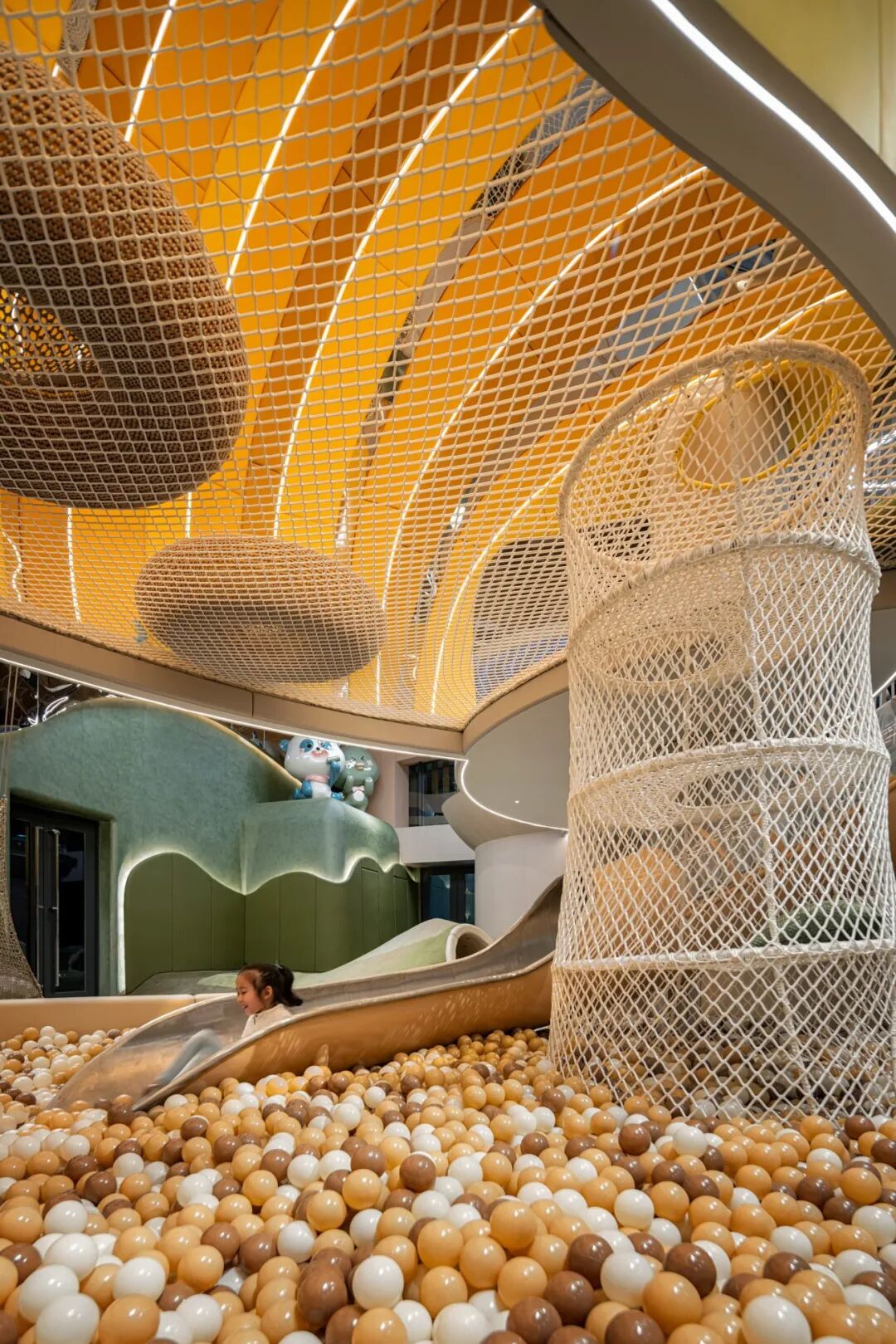 橙色调的第三区域是浮叶结构,包括绳索数组和蹦床。孩子们可以在这个半封闭的空间里玩捉迷藏,进行反重力运动。