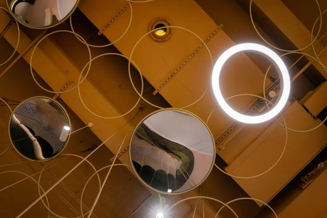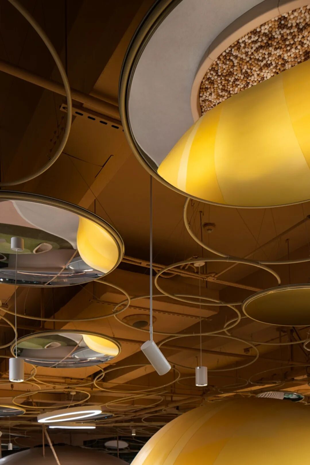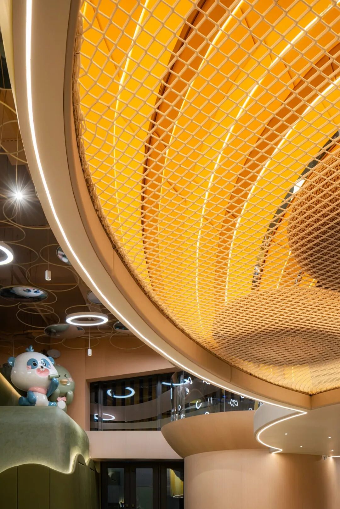 整体开敞的天花布满富有韵律感的凸面镜面圆盘,结合扭曲的镜面墙,视觉上纵横延伸,增加了梦幻感。不同定制设计的3D卡通角色赋予了整个空间生命并完成品牌叙事。