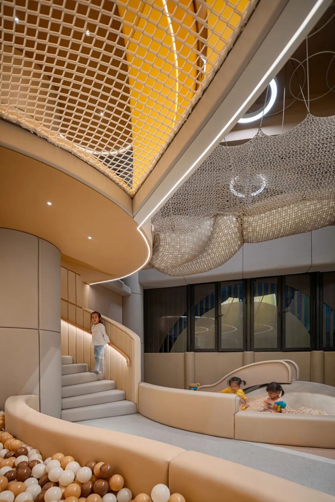 位于深圳南山公园的一栋独立建筑内,双层高体量的特点通过新建的夹层得到充分体现,为孩子们的自我探索创造垂直延伸和空间刺激。整个环境完全由曲线构成,打破了建筑外围边界的僵化,无缝连接了位于三个不同层次的所有活动区域。为了遵循曲线构造,模仿了山谷季节性变化的抽象景观,以激发孩子的想象力。整体设计语言是对象征性颜色、形状、比例和触感的策略性操作,以满足游乐场的功能和情感需求,并为孩子和父母带来难忘的体验。