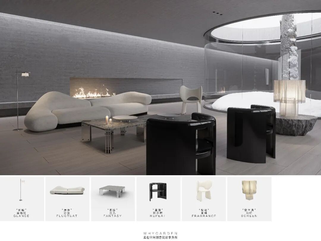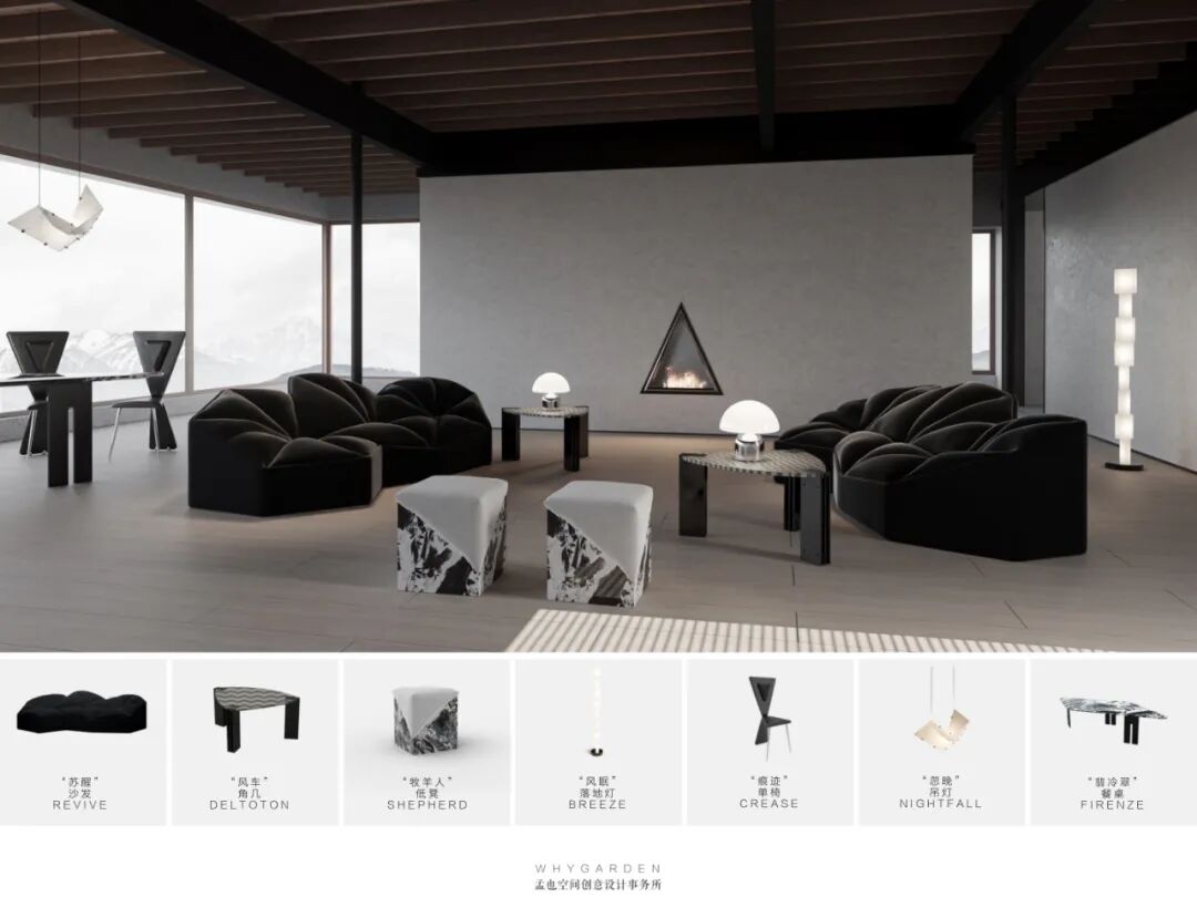 孟也:“斯瓦尔巴特”(沙发 SVALBARD),“凯乐莉莉”(座椅CALLALILY),“新地”(落地灯NOVAYA ZEMLYA),“苏醒”(沙发 REVIVE), “水波” (沙发WAVE ),“忽晚”(吊灯NIGHTFALL)等。