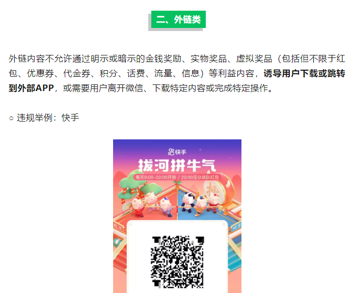 今年春节期间,微信还曾发布过一则处理违规营销内容的通知,其中就包括这样两条:一是为避免过度营销内容对用户的骚扰,请不要唆使用户在朋友圈和会话内发布及传播具有识别、标记功能的特殊识别码、口令类信息;二是外链内容不允许通过明示或暗示的金钱奖励、实物奖品、虚拟奖品等利益内容,诱导用户下载或跳转到外部APP。