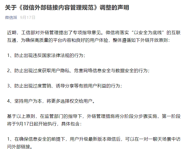 微信在9月发布的那篇调整外链声明中提到了外链遵循的原则,其中两条为:防止出现过度获取用户隐私、危害网络信息安全与数据安全的行为;防止出现过度营销、诱导分享等有损用户利益的行为。