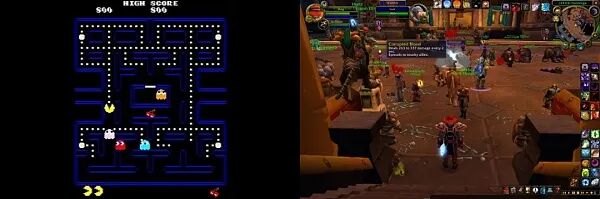 几乎所有早期的视频游戏都以相同的收入模式开始。用户为玩游戏而付费。第一批游戏,如《吃豆人》(左),允许玩家玩一两轮,然后再要求更多付款。后来发展到个人电脑上的游戏,如《使命召唤》或《魔兽世界》(右),则出售永久许可证或经常性订阅。虽然交易很简单,但用户并没有什么影响力。最明显的改进是以内容扩展包的形式提供更多的游戏时间。