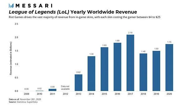 后者的一个例子是通过销售可定制的外观"皮肤"。皮肤除了外观上的吸引力外,几乎不提供任何价值--它们不会给购买者带来任何竞争优势--但热情的粉丝却对其有很高的需求。例如,游戏工作室Riot Games就因为为其《英雄联盟》系列游戏中热销的皮肤而成为一家价值数十亿美元的公司。请注意这些皮肤和游戏化的NFTs之间的相似之处。