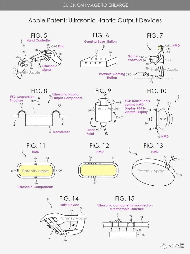 苹果公司的专利图7是具有超声波触觉输出组件的说明性电子设备的透视图,该组件向用户身体的不同部位提供触觉输出;图8是一个说明性超声波触觉输出设备的截面侧视图。