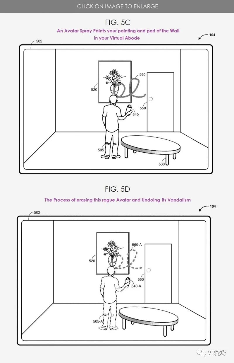 根据苹果公司的说法,用户能够至少削弱与第二用户相关的虚拟化身的部分,包括削弱与第二用户行为相关的SR内容。例如,在图5C中,虚拟化身#505通过在画#520和墙上喷涂涂鸦#560,违反了虚拟化身社交交互标准,随后在下面的图5D中,涂鸦560-A、喷壶540-A和虚拟化身505-A被部分削弱或完全不可见。