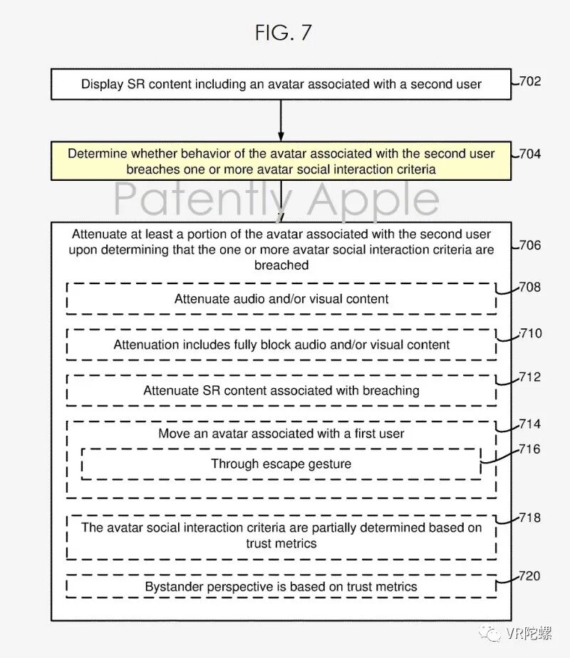 苹果公司的专利图7是一个流程图,表示根据一些实施方案,基于违反虚拟化身社交交互标准的弱化方法#700。