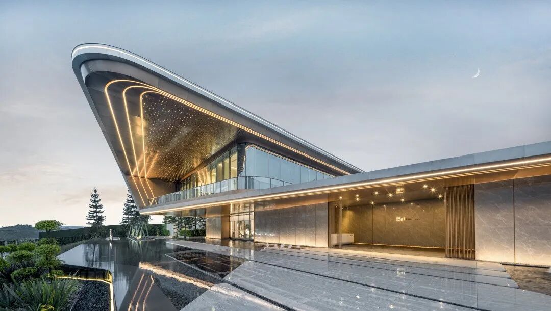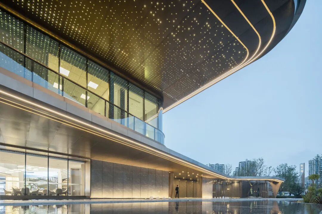 景观设计与建筑近十轮交流沟通,将建筑进行延展形成大门与亭廊,共同打造第一形象界面。二层顶部线条转折成为一层屋顶,穿过大门,也穿出大树,立面一二层统一了玻璃元素,像一面横向展开的橱窗,在水的倒影里和谐飘逸。同时大门作为大区未来归家主入口,又关联着未来生活。
