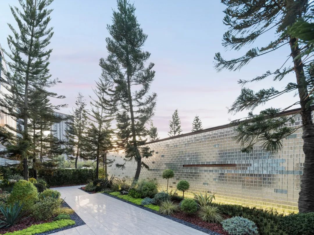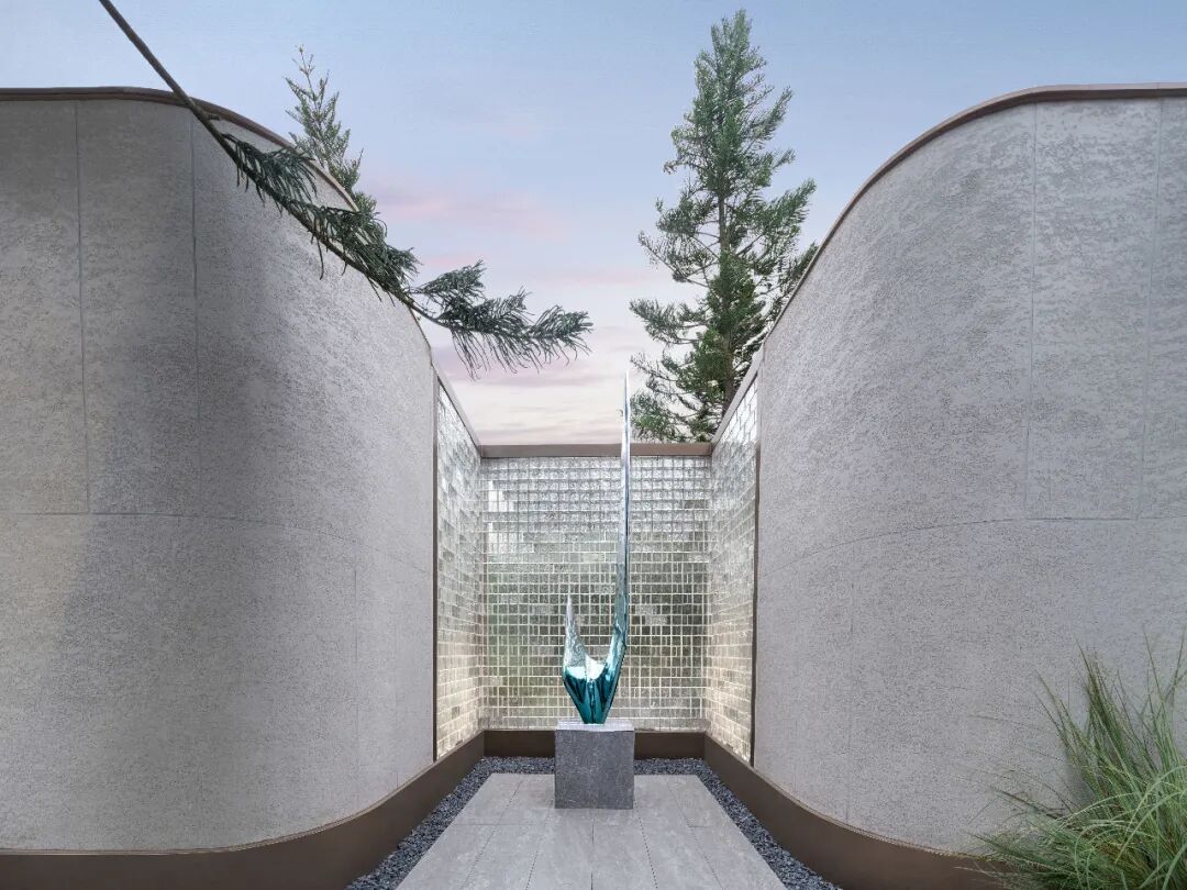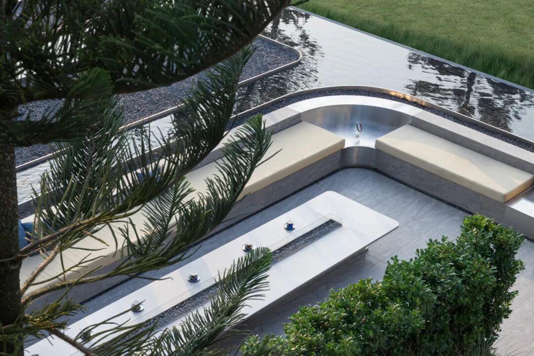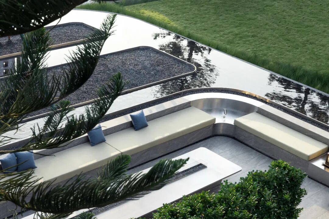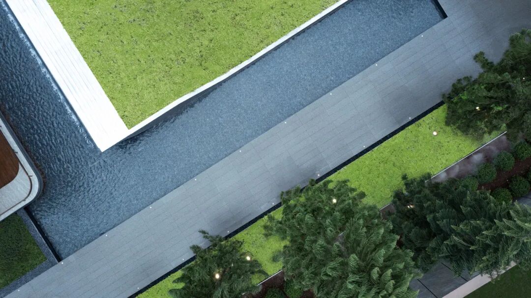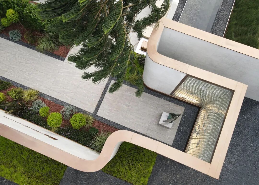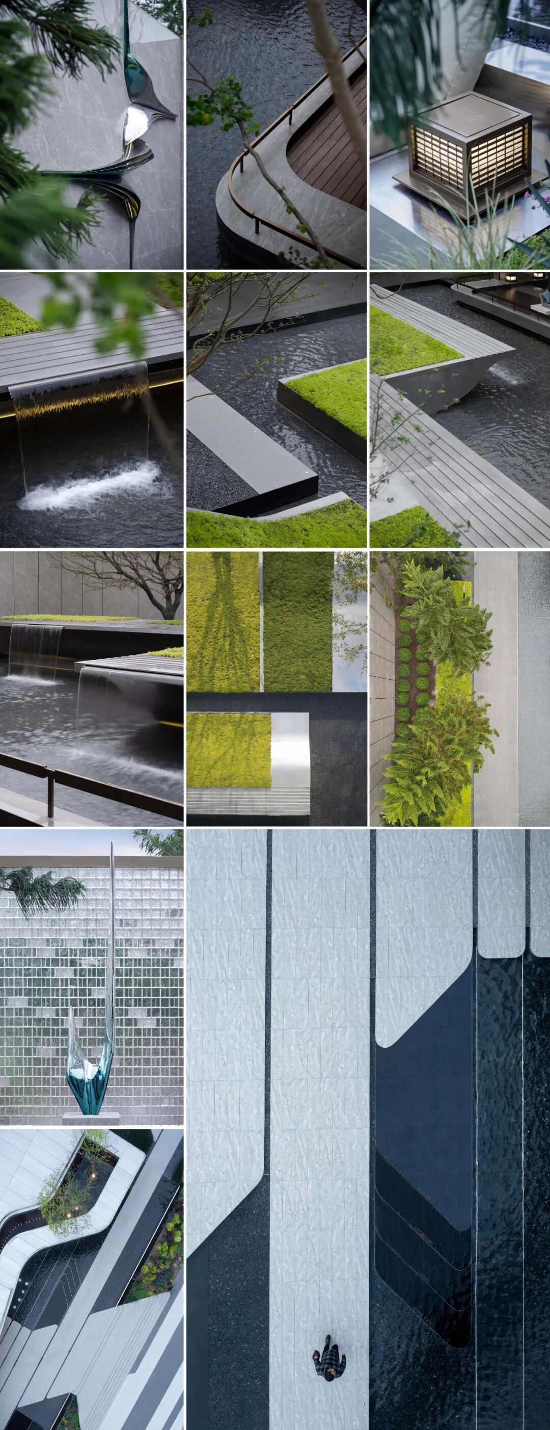 水景、石材、金属、植物碰撞出几何色彩的狂想曲,水景生长出绿岛,是大地的触角,伴随流水一起呼吸。