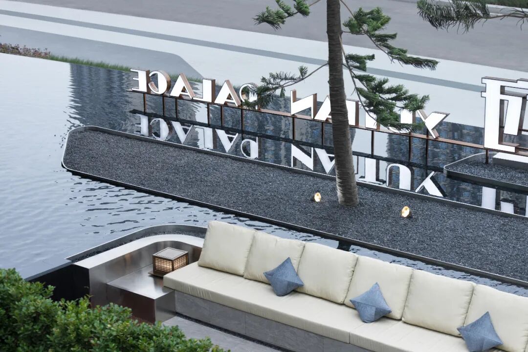 景观元素表达的形式无需界定,坚硬的金属、晶莹的玻璃,当这些元素遇到自然的流水、阳光、花草、树木便融为一体。现代流动的空间,在大地与星河之间留下优雅的轨迹,点亮心中的浮岛。汀步有序地分割水面,金属线条分割池底的黑色砾石、片岩。