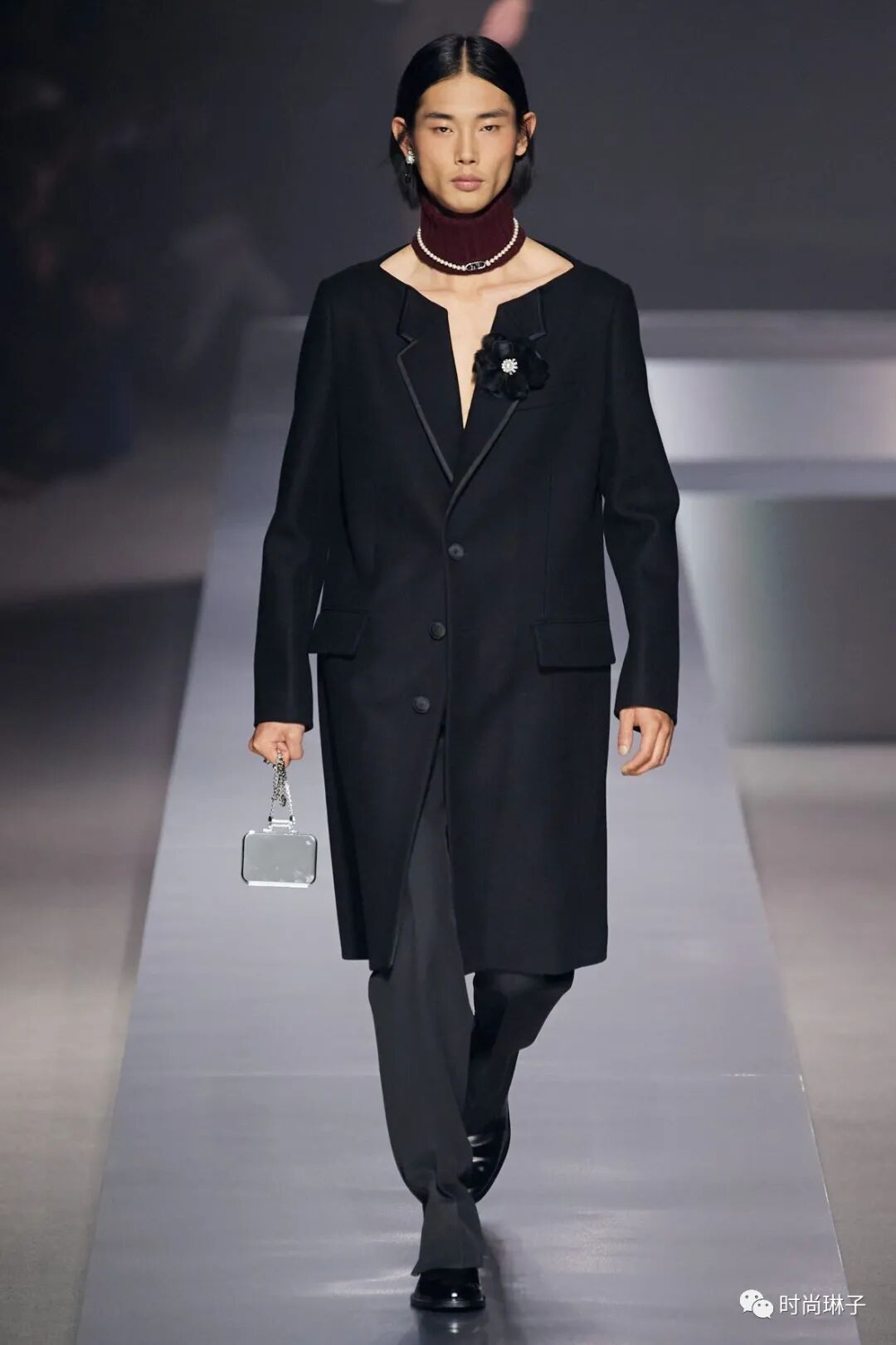 女性化的斗篷式上衣,以及低领口设计的西装搭配花朵胸针和毛领配饰,细节的设计让男士着装更多了一些仪式感。