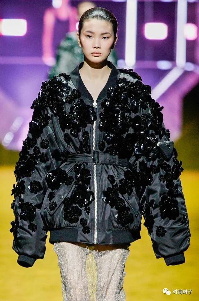 宽松廓形的飞行员夹克,镶嵌着女性化的水晶花朵或羽毛,舒适且别致。
