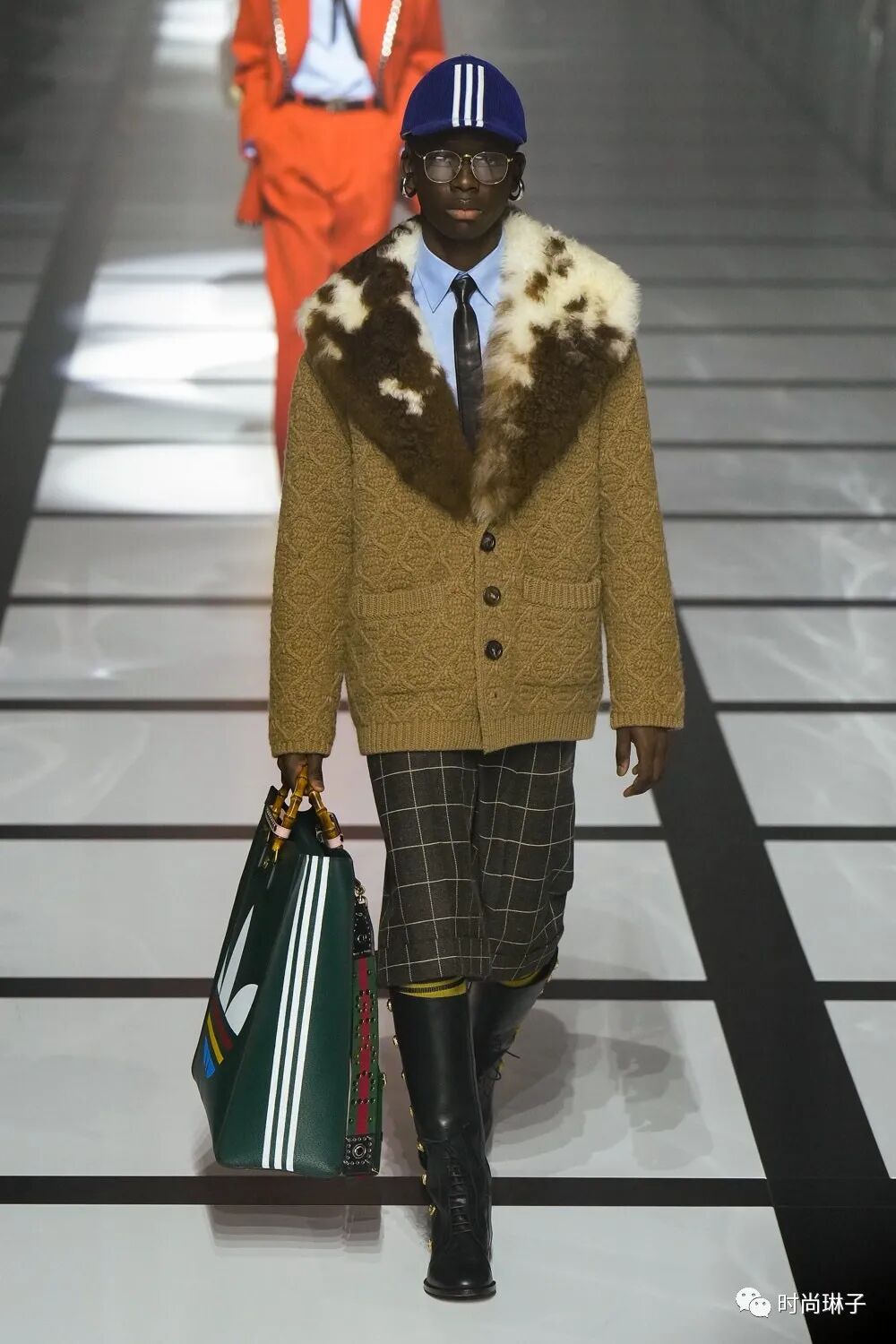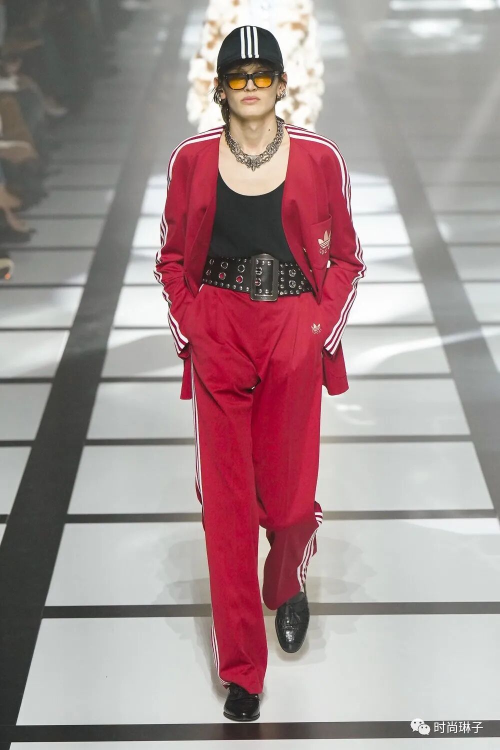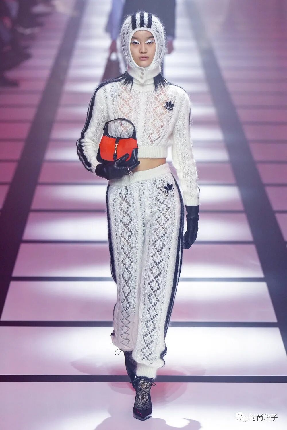 阿迪达斯标志性的三条纹除了出现在古驰上衣和裤装的侧缝上,还在搭配皮草大衣的高跟靴,现在流行的巴拉克拉法帽,以及手套等配饰上,打造出精致的休闲风系列。