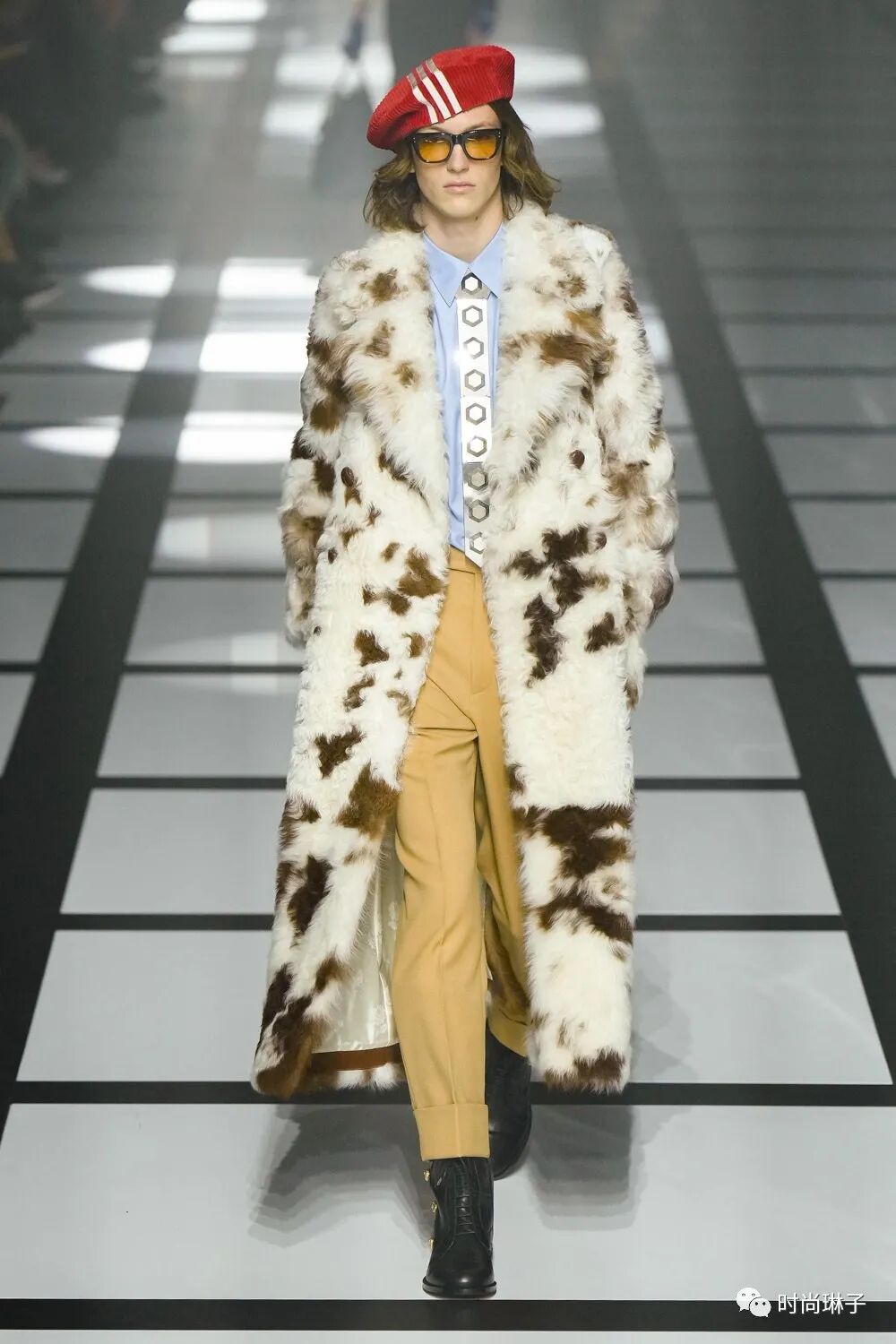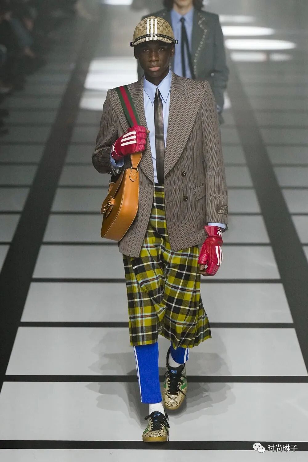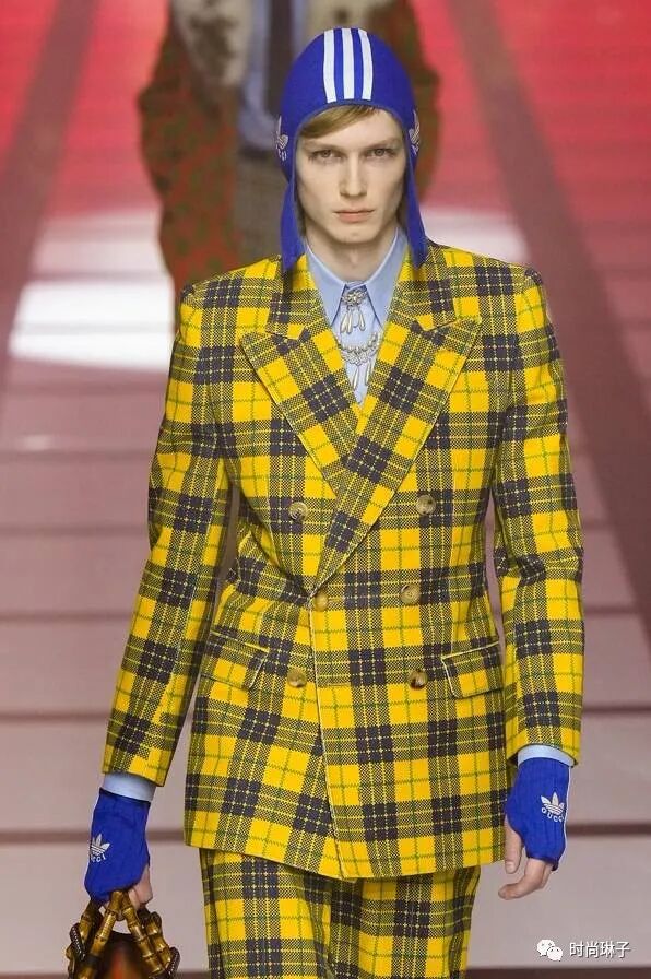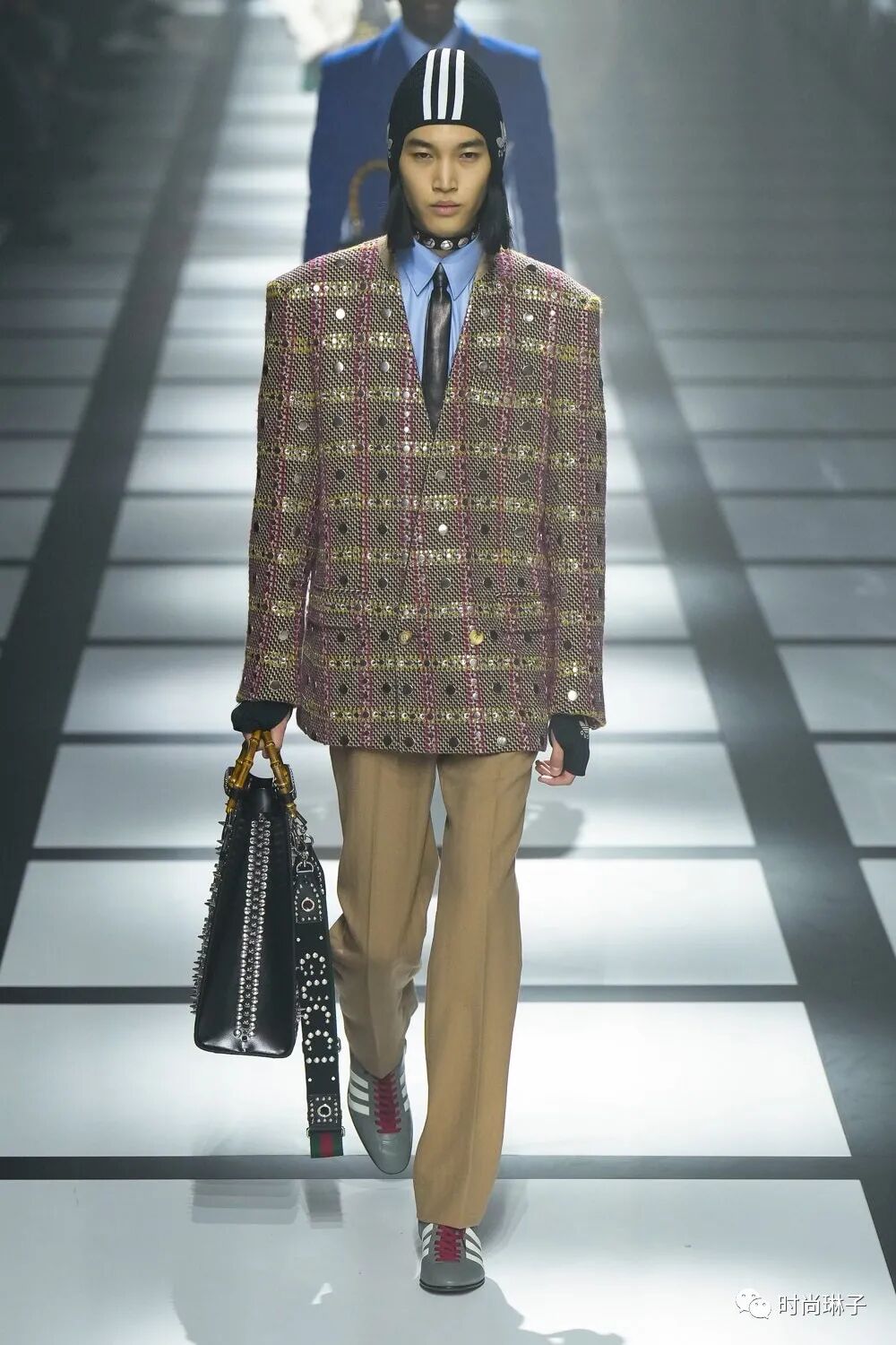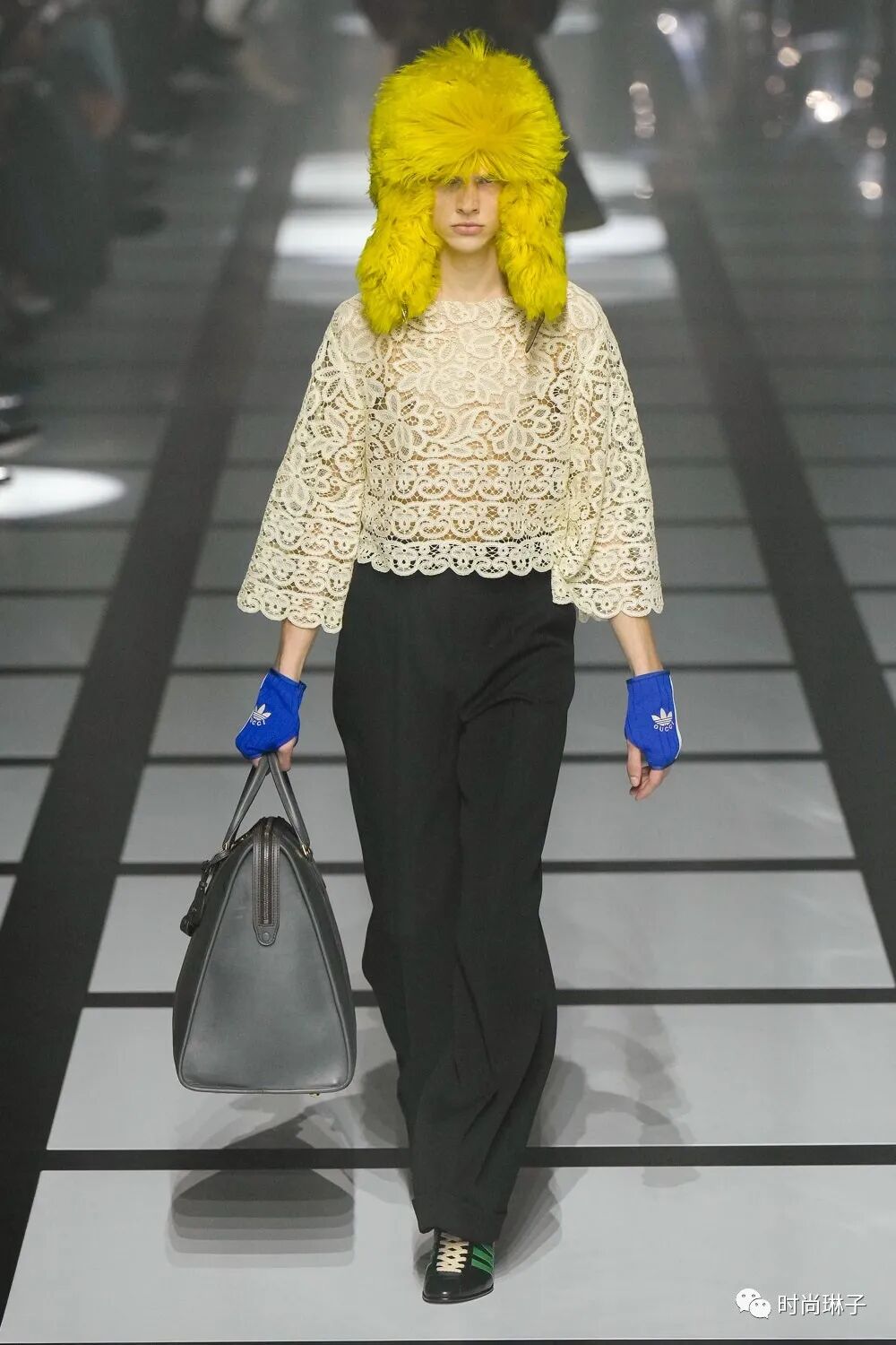 阿迪达斯标志性的三条纹除了出现在古驰上衣和裤装的侧缝上,还在搭配皮草大衣的高跟靴,现在流行的巴拉克拉法帽,以及手套等配饰上,打造出精致的休闲风系列。