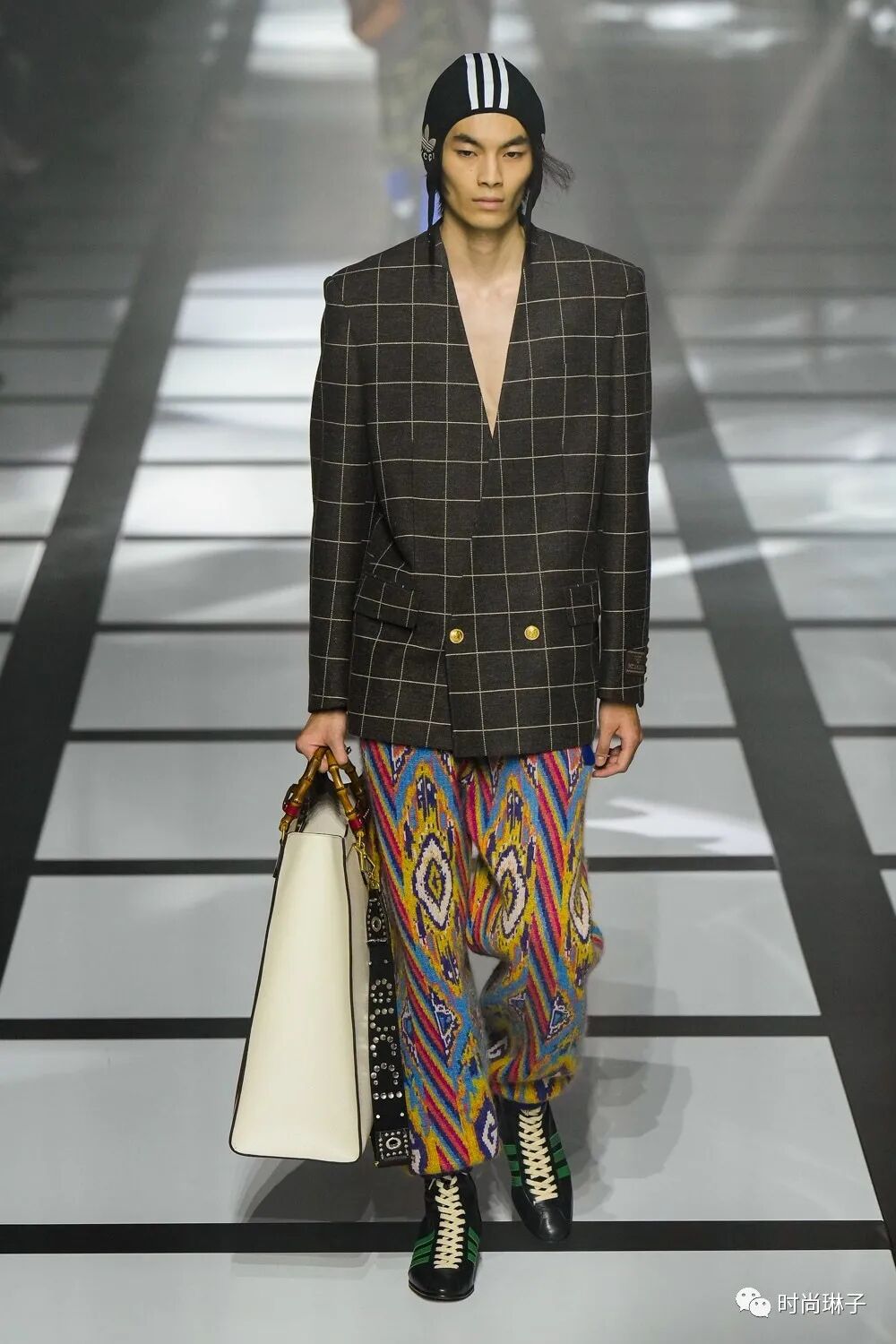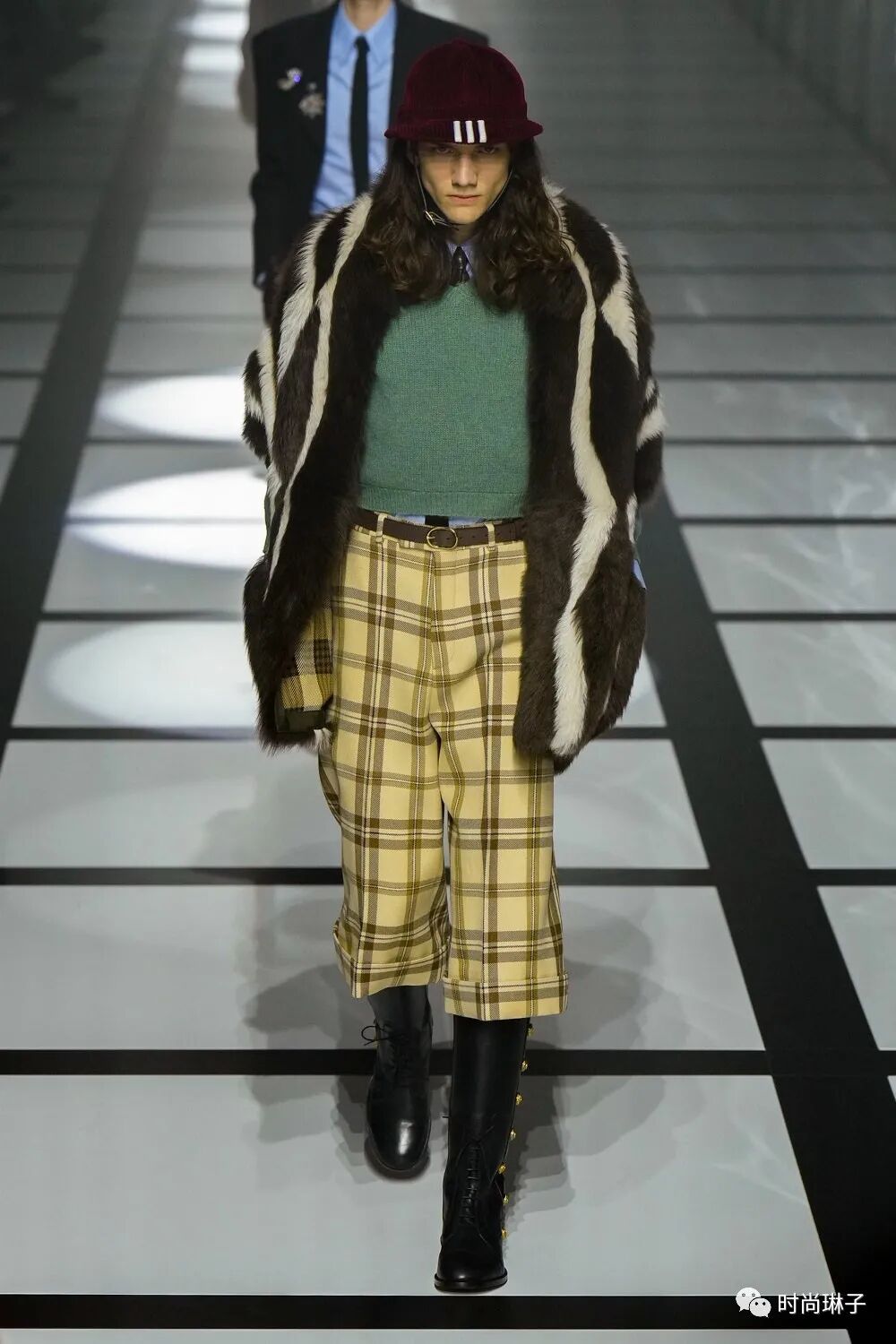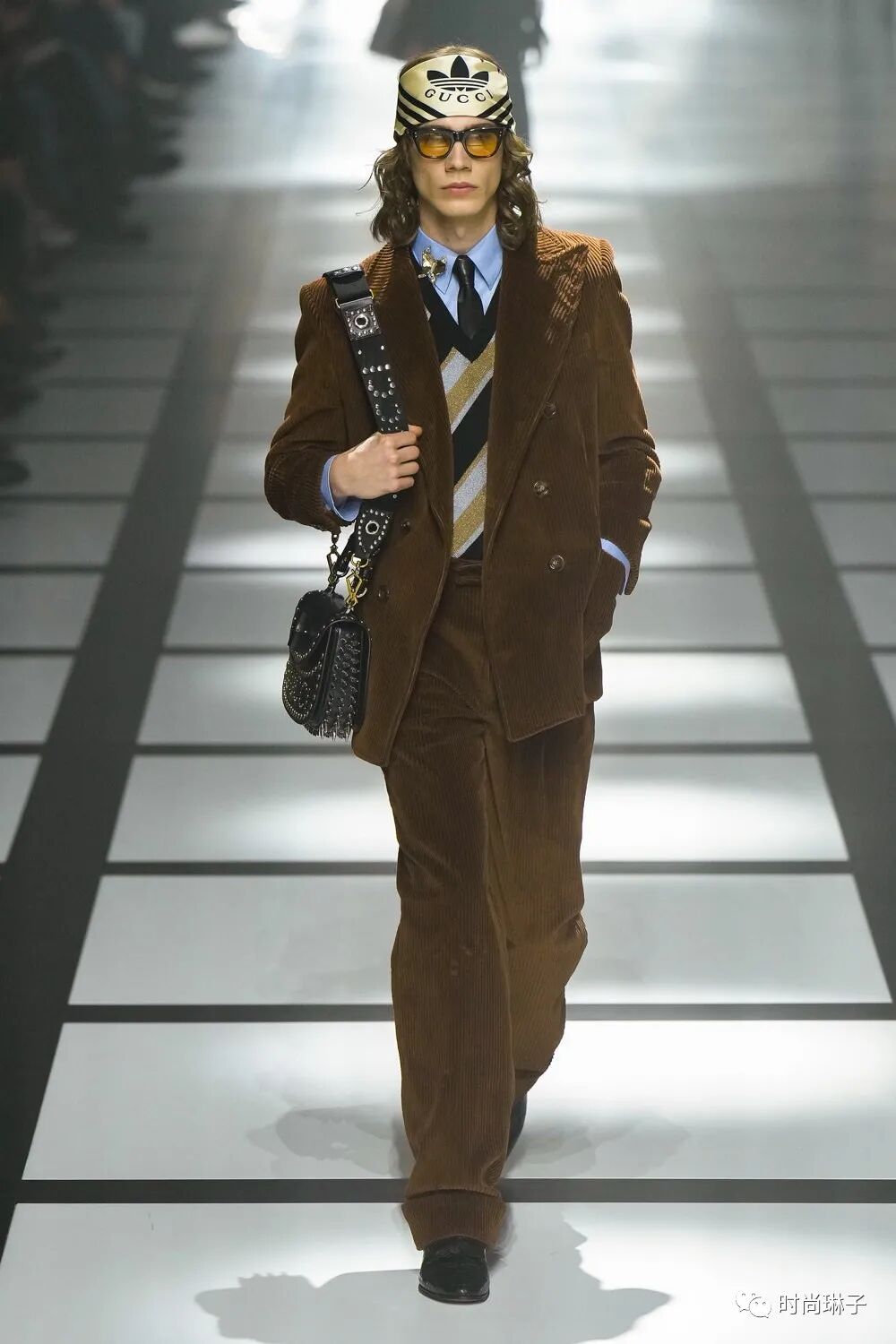 阿迪达斯标志性的三条纹除了出现在古驰上衣和裤装的侧缝上,还在搭配皮草大衣的高跟靴,现在流行的巴拉克拉法帽,以及手套等配饰上,打造出精致的休闲风系列。