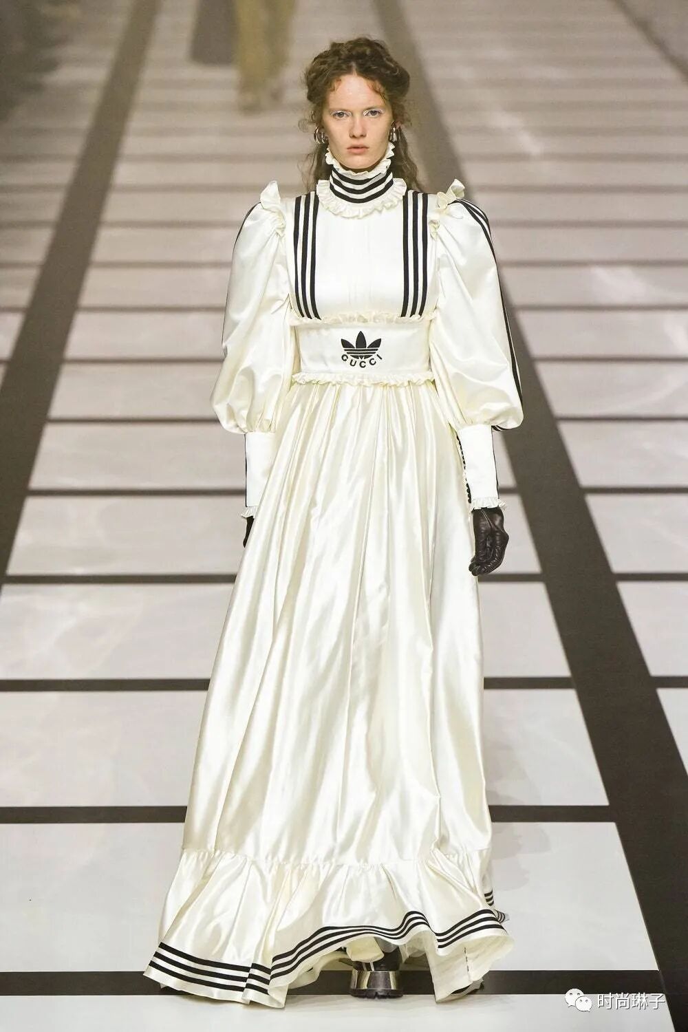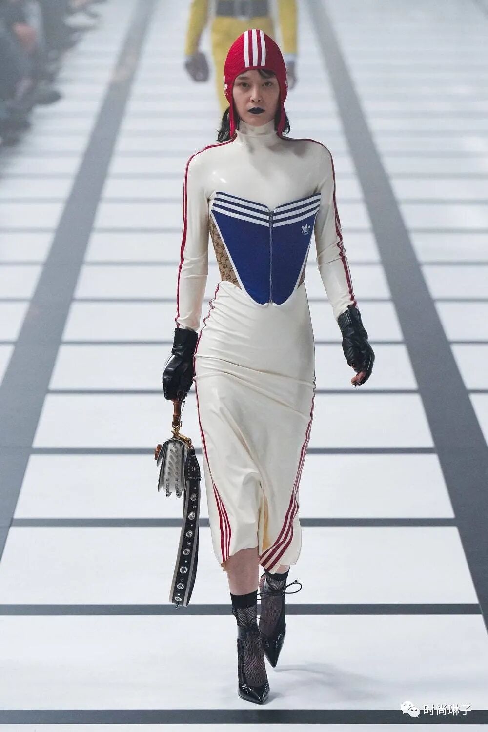运动休闲礼服裙将阿迪达斯的标志元素与古驰的设计元素完美结合,收腰的廓形更凸显了女性精致之美。