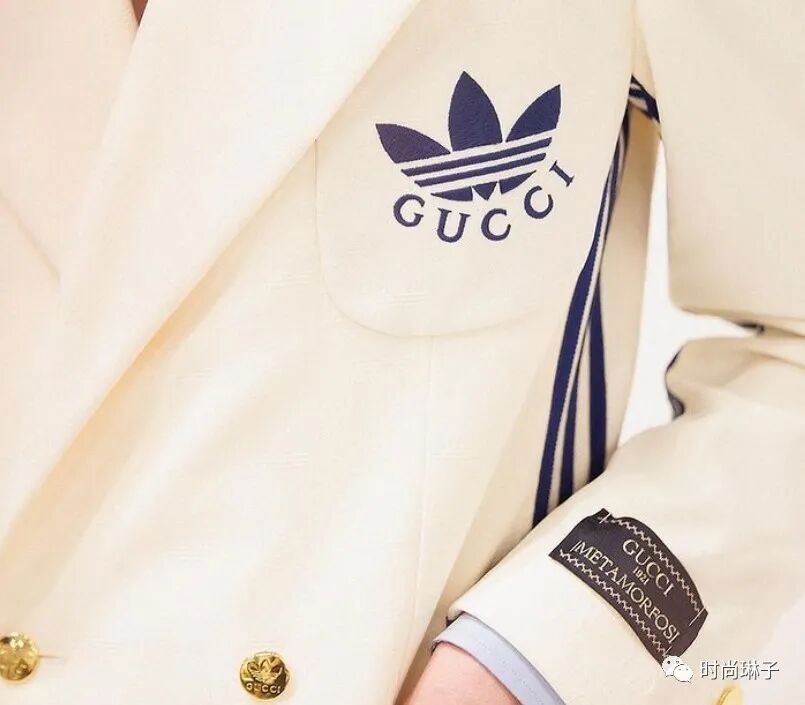 阿迪达斯标志性的三叶草标志和GUCCI古驰品牌名称组合成2022秋冬系列的新标志,印在精致的古驰西服胸口,内搭T恤或纽扣等配饰上。运动风十足的三条纹与精致的西服套装结合,碰撞出奇幻的火花。