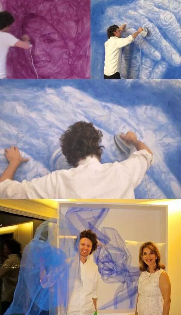 Benjamin Shine擅于用蒸汽熨斗熨烫在织物之上塑造出独具风格的人物肖像,实现了以布料作画的精湛手艺。